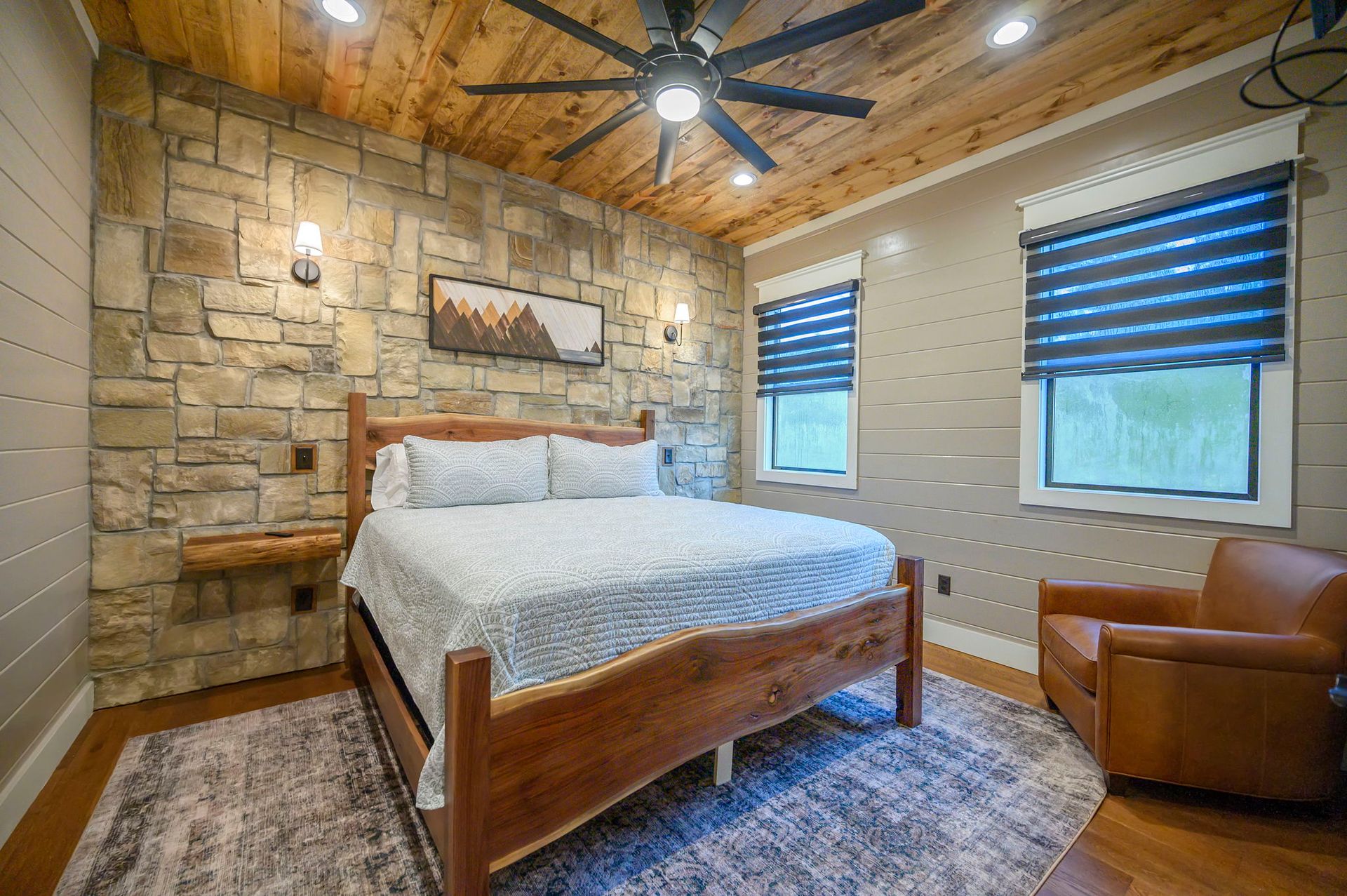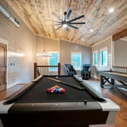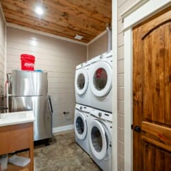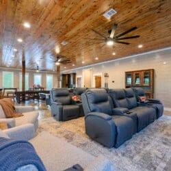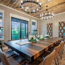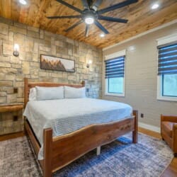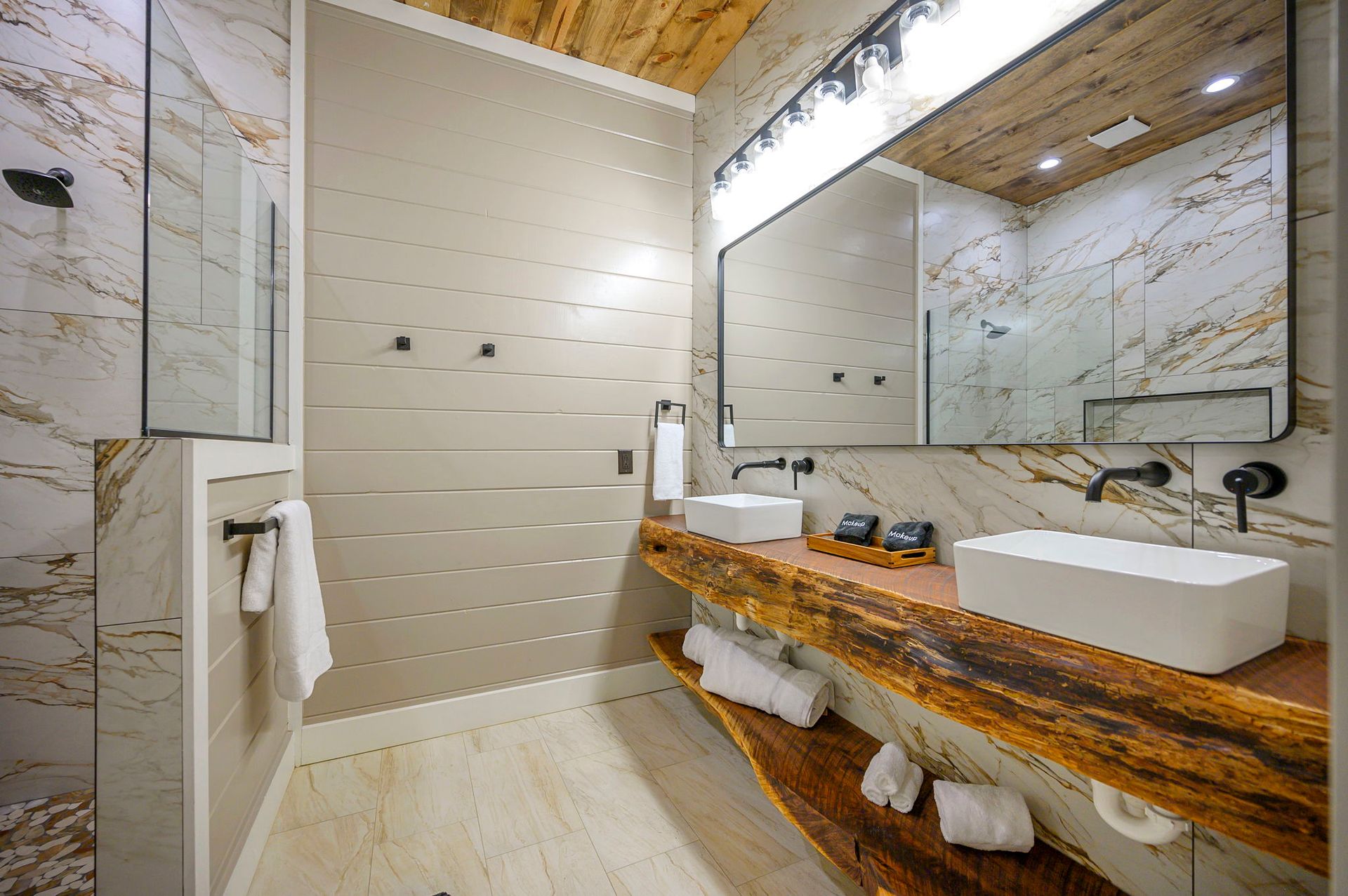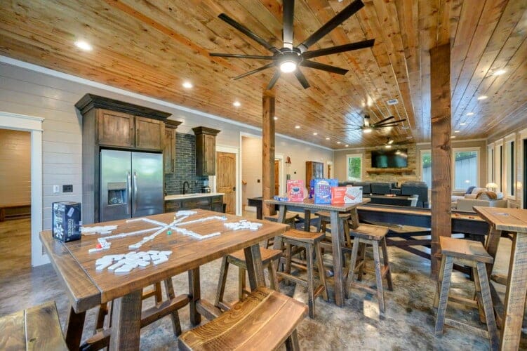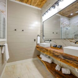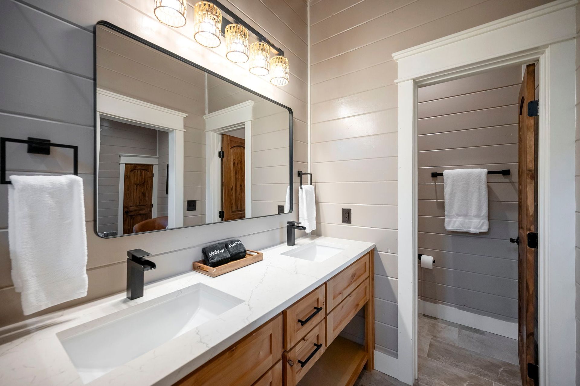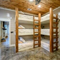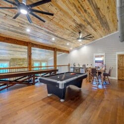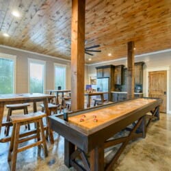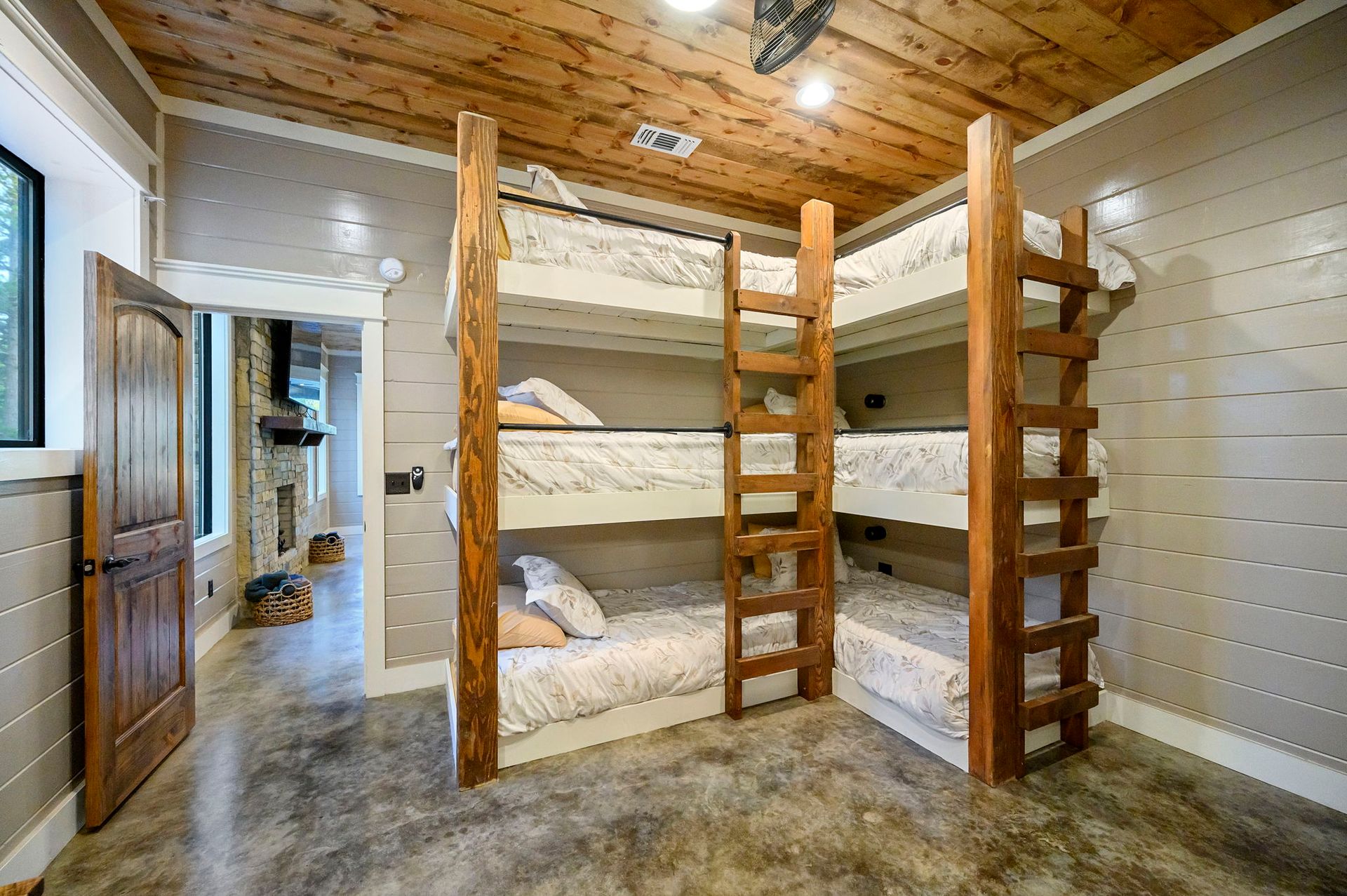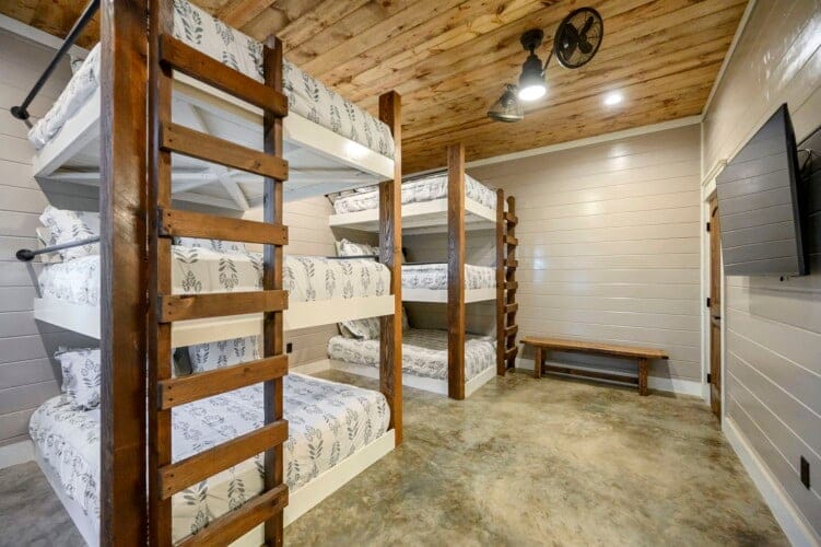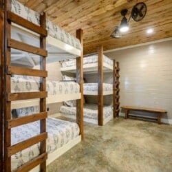 When it’s time to rest, Whiskey Trip delivers luxury and privacy in every suite. The main floor features four king suites, each equipped with a smart TV, nightstands, and an en-suite bathroom with a walk-in shower and vanities. The second floor features two additional king suites with private balconies—ideal for savoring morning coffee with a stunning view. Downstairs, the bunk rooms turn sleepovers into lasting memories, with one room featuring queen bunks that sleep 12 and another with twin bunks for six. Each room features its own bathroom and TV, providing each guest with their own private corner of comfort.