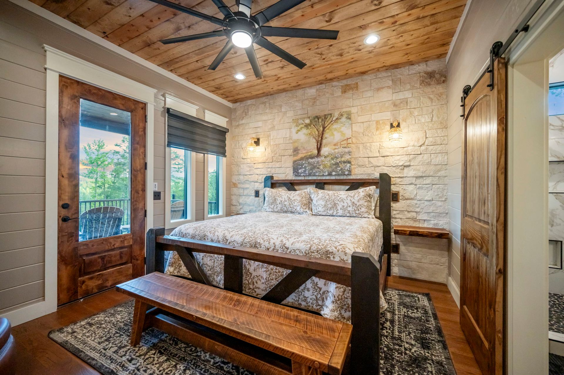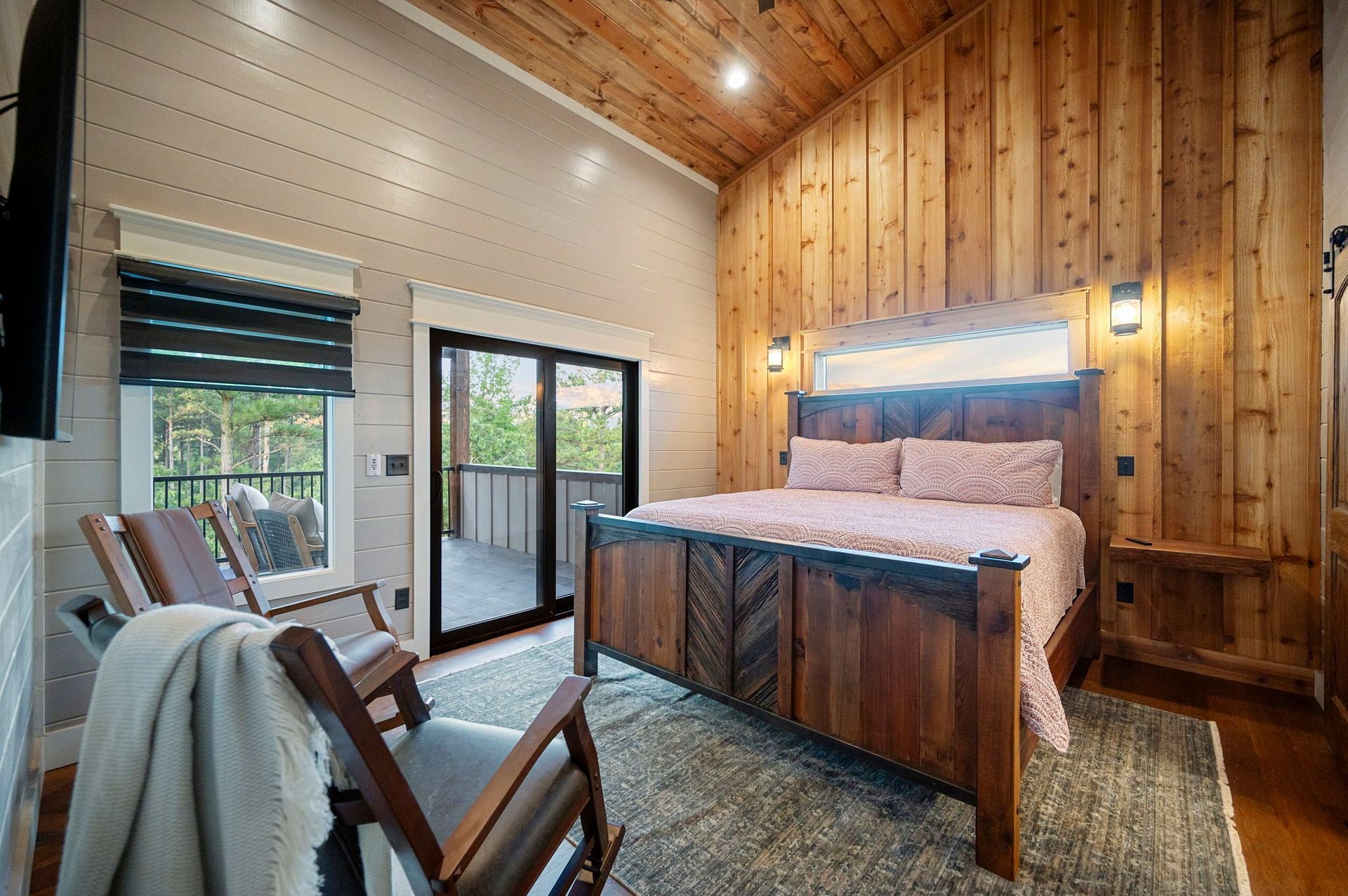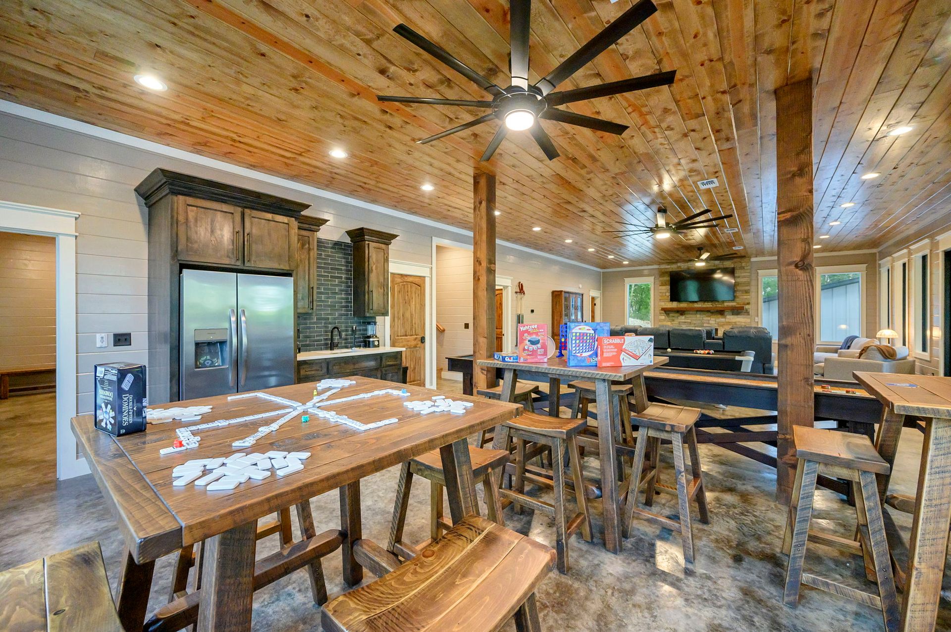 The outdoor experience at Whiskey Trip is nothing short of spectacular. On the main deck, guests can cook in the outdoor kitchen with a hard-lined gas grill, dine together at the large table that doubles as a ping-pong setup, and take in views of the private pool below. The lower patio offers even more space to spread out, complete with another full outdoor kitchen, fireplace, and hot tub overlooking the pool. Whether you’re sipping wine by the firepit or cheering on a friendly match on the private pickleball court, this space turns every moment into something memorable.
