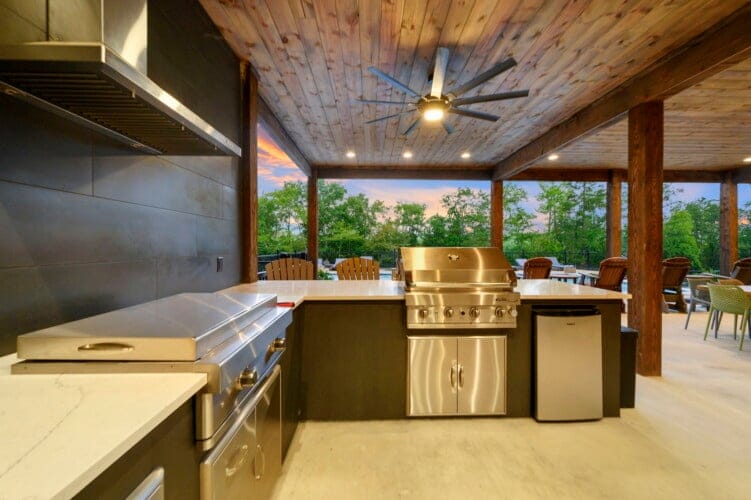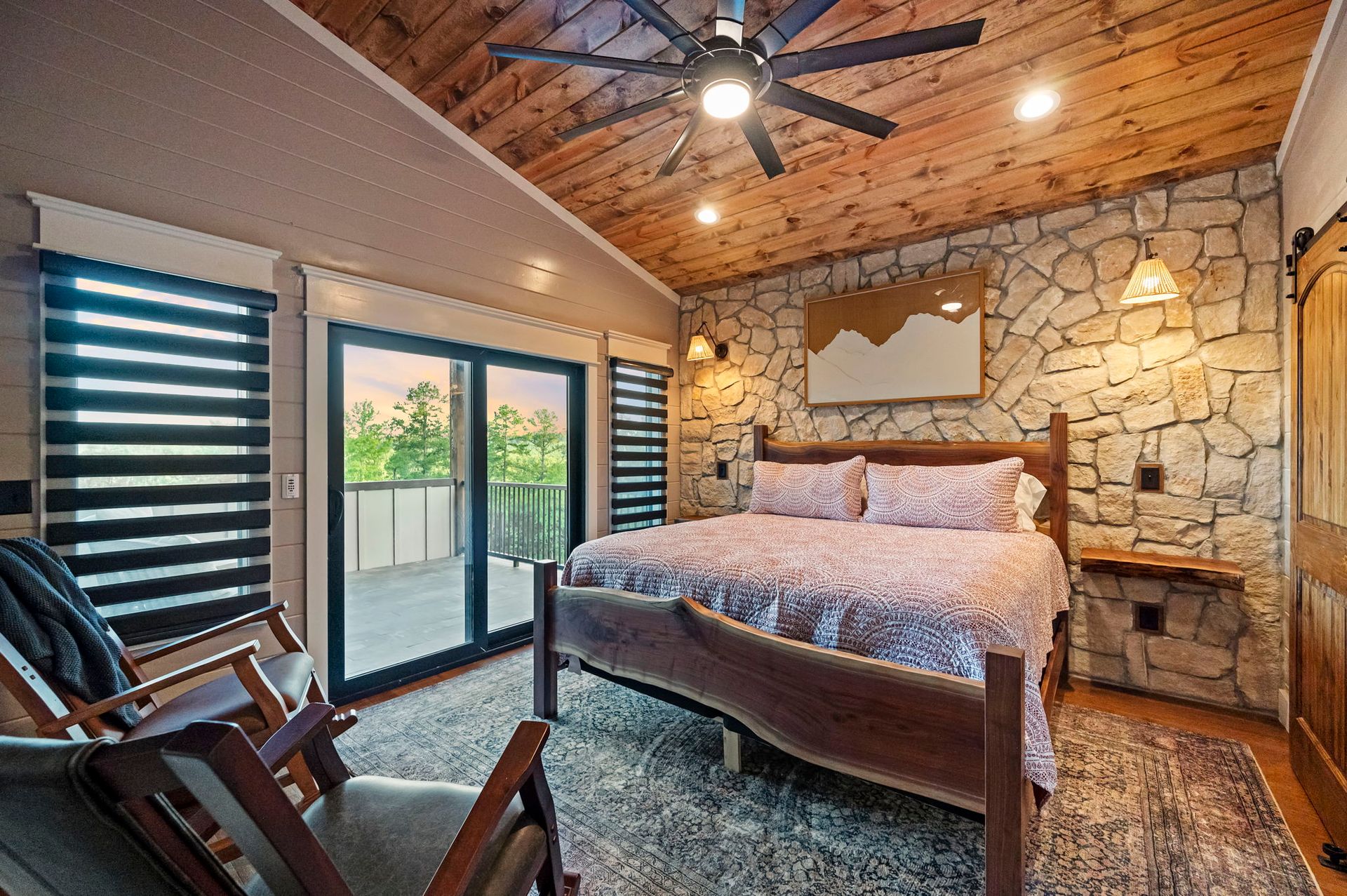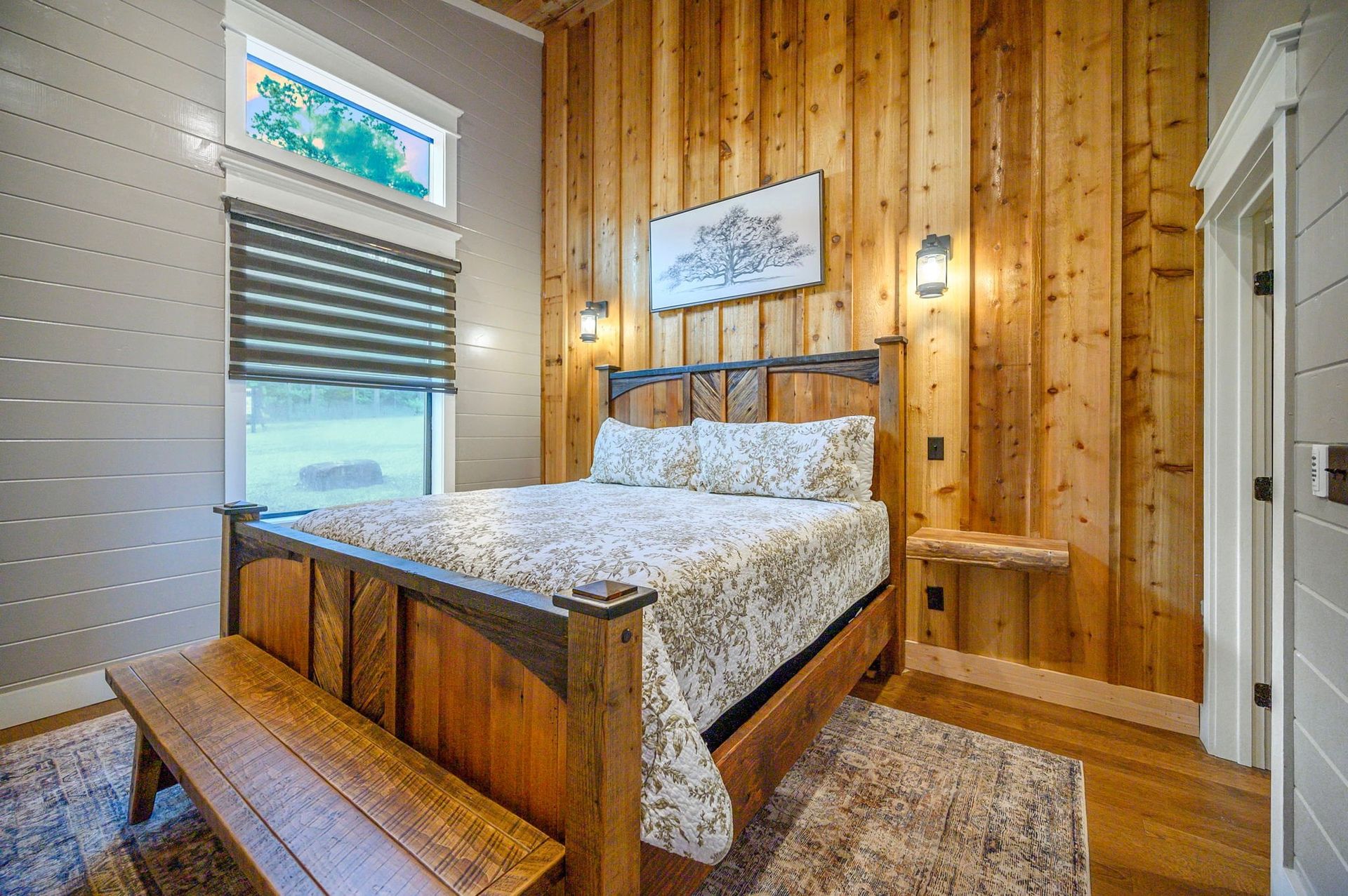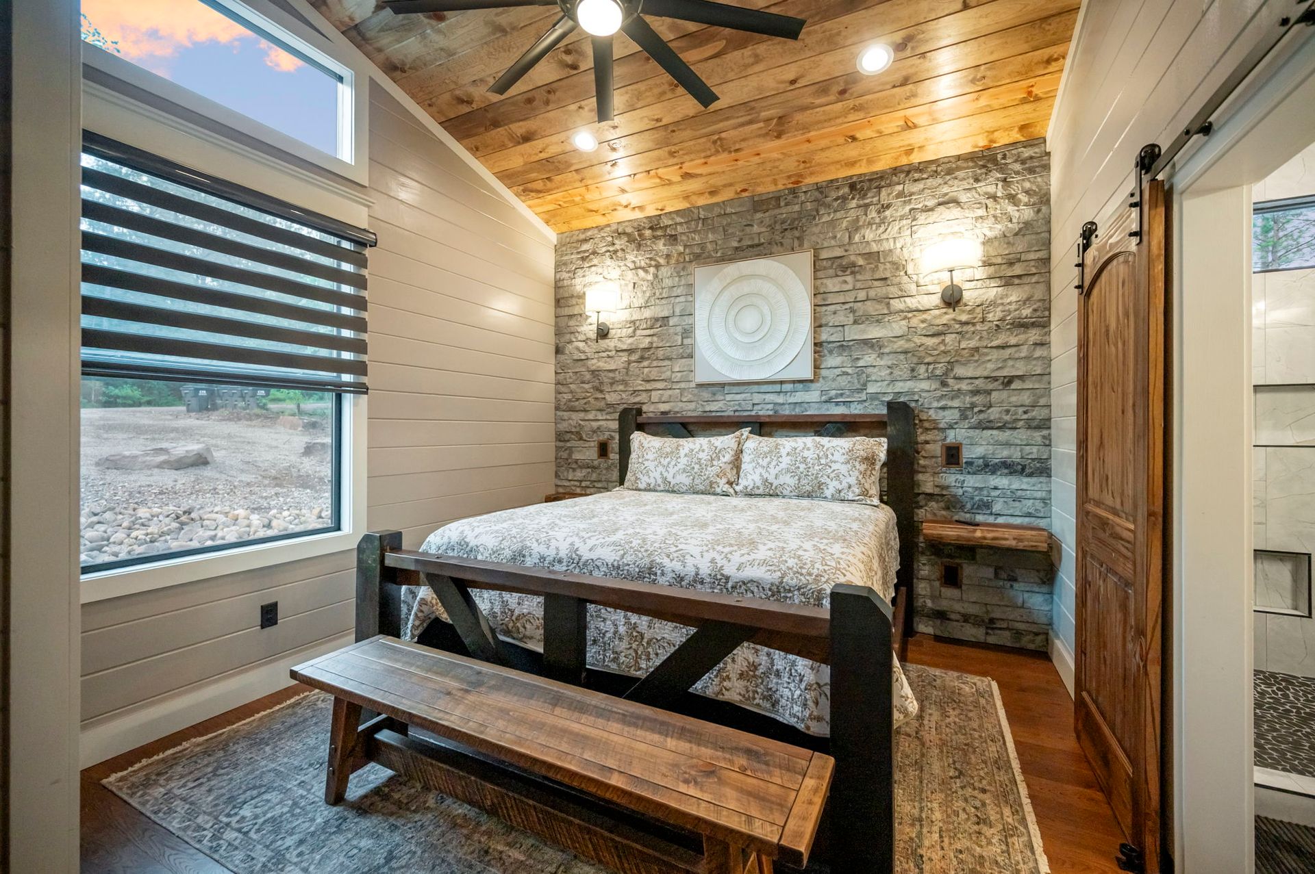 The outdoor experience at Whiskey Trip is nothing short of spectacular. On the main deck, guests can cook in the outdoor kitchen with a hard-lined gas grill, dine together at the large table that doubles as a ping-pong setup, and take in views of the private pool below. The lower patio offers even more space to spread out, complete with another full outdoor kitchen, fireplace, and hot tub overlooking the pool. Whether you’re sipping wine by the firepit or cheering on a friendly match on the private pickleball court, this space turns every moment into something memorable.