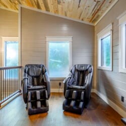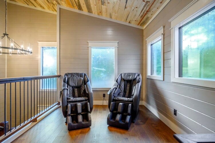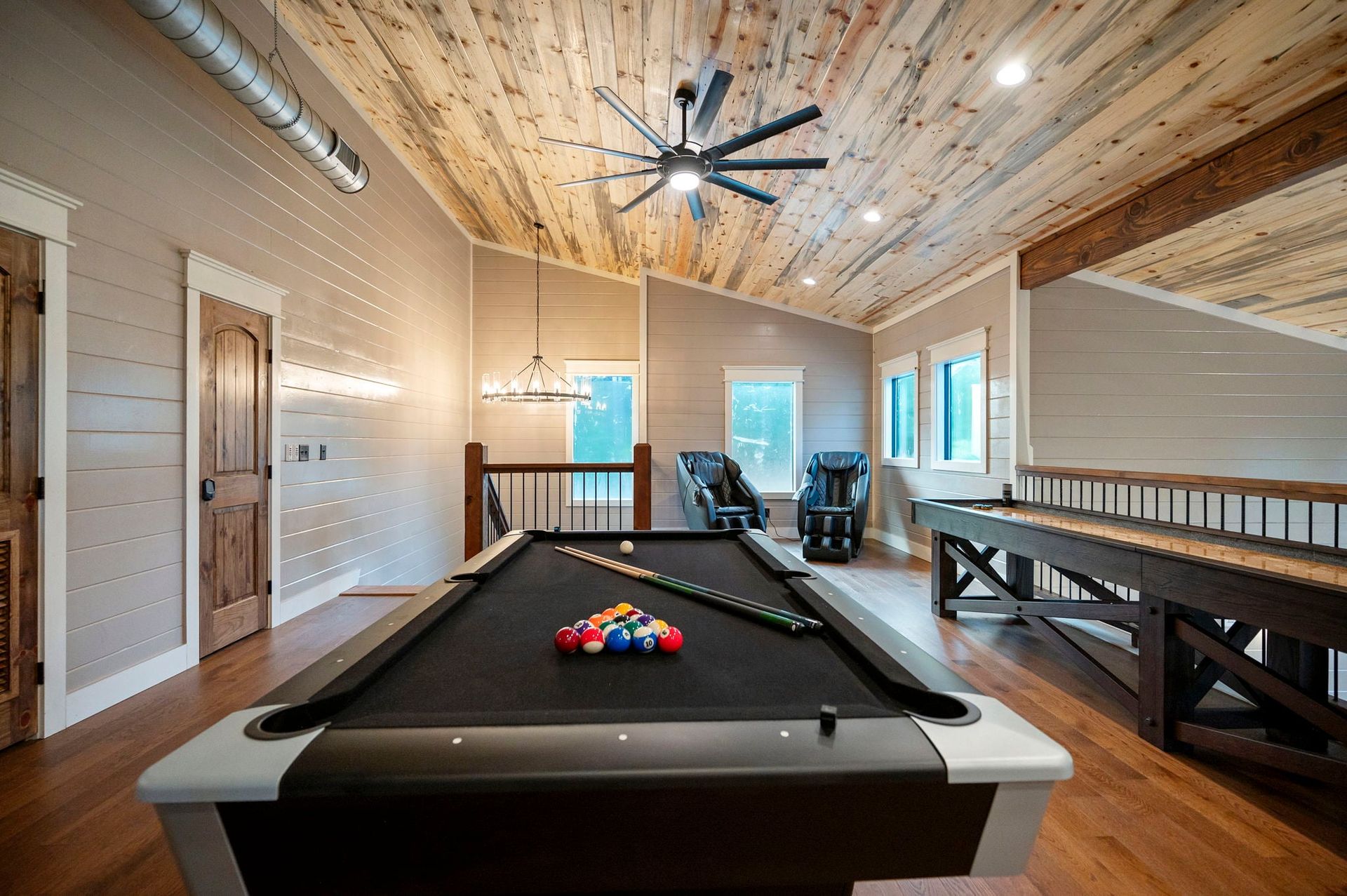 On the second level of Whiskey Trip, the loft game lounge takes entertainment up a notch. Two massage chairs invite you to unwind, while others enjoy a friendly round of shuffleboard or pool. The wet bar—complete with a mini fridge, blender, and ice maker—keeps the good times flowing without the need to head downstairs. Movie nights come alive on the big-screen TV, or you can sit around the game table for cards and laughter that stretches late into the night.