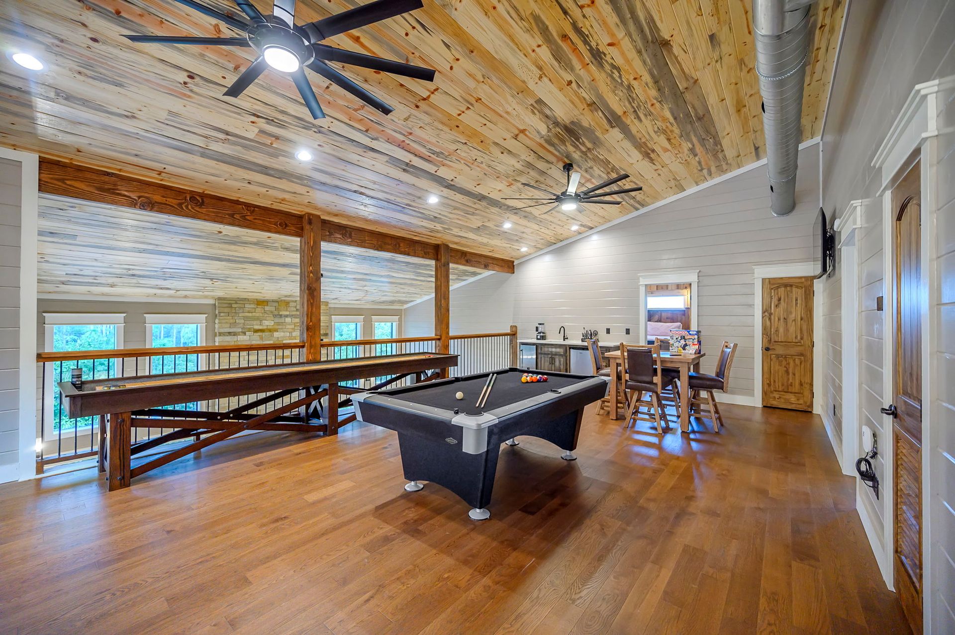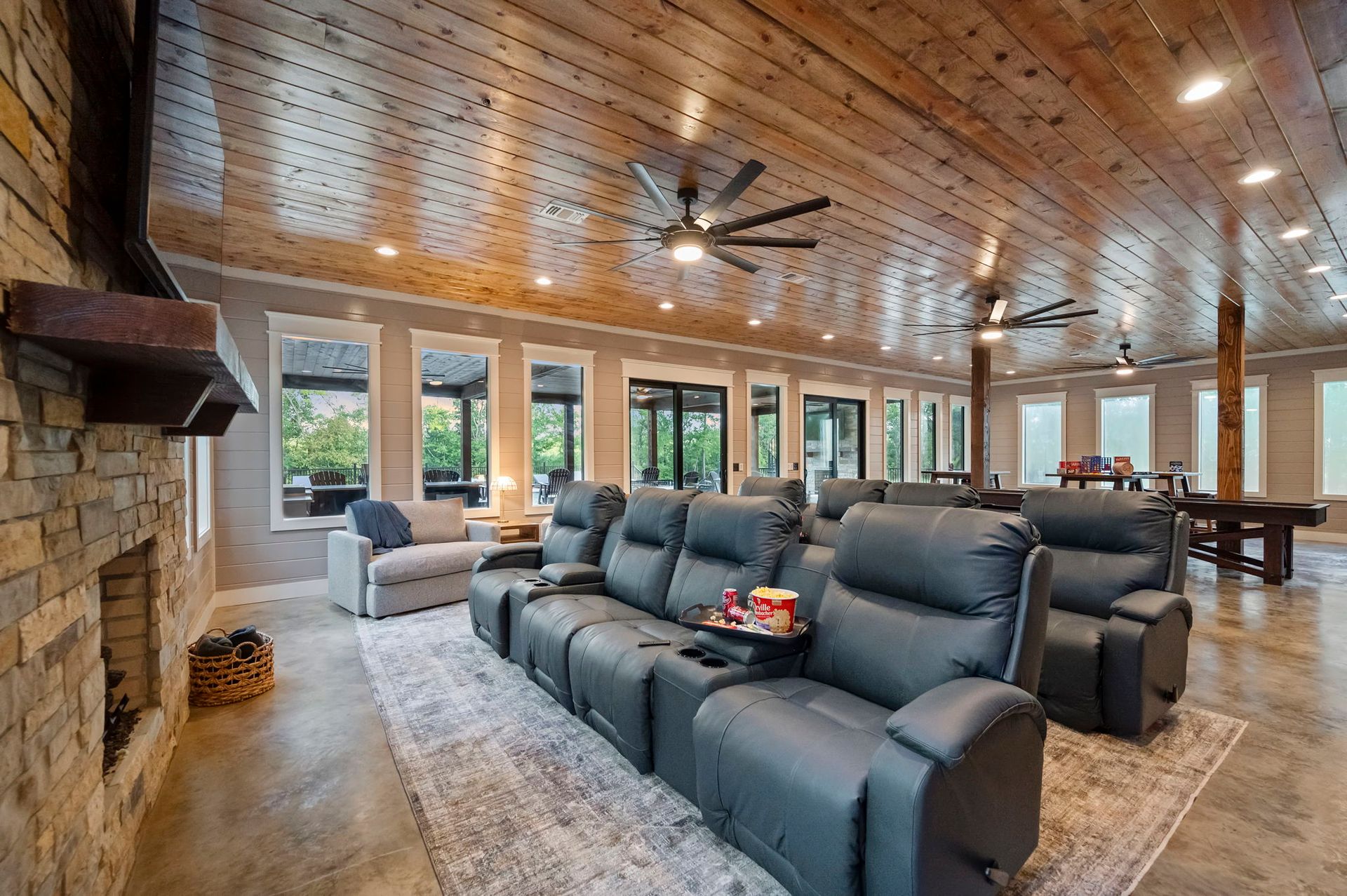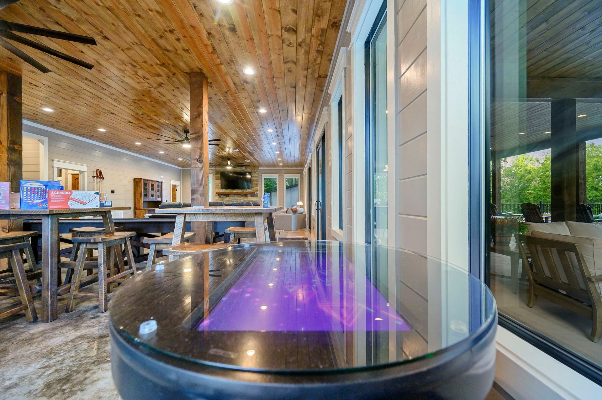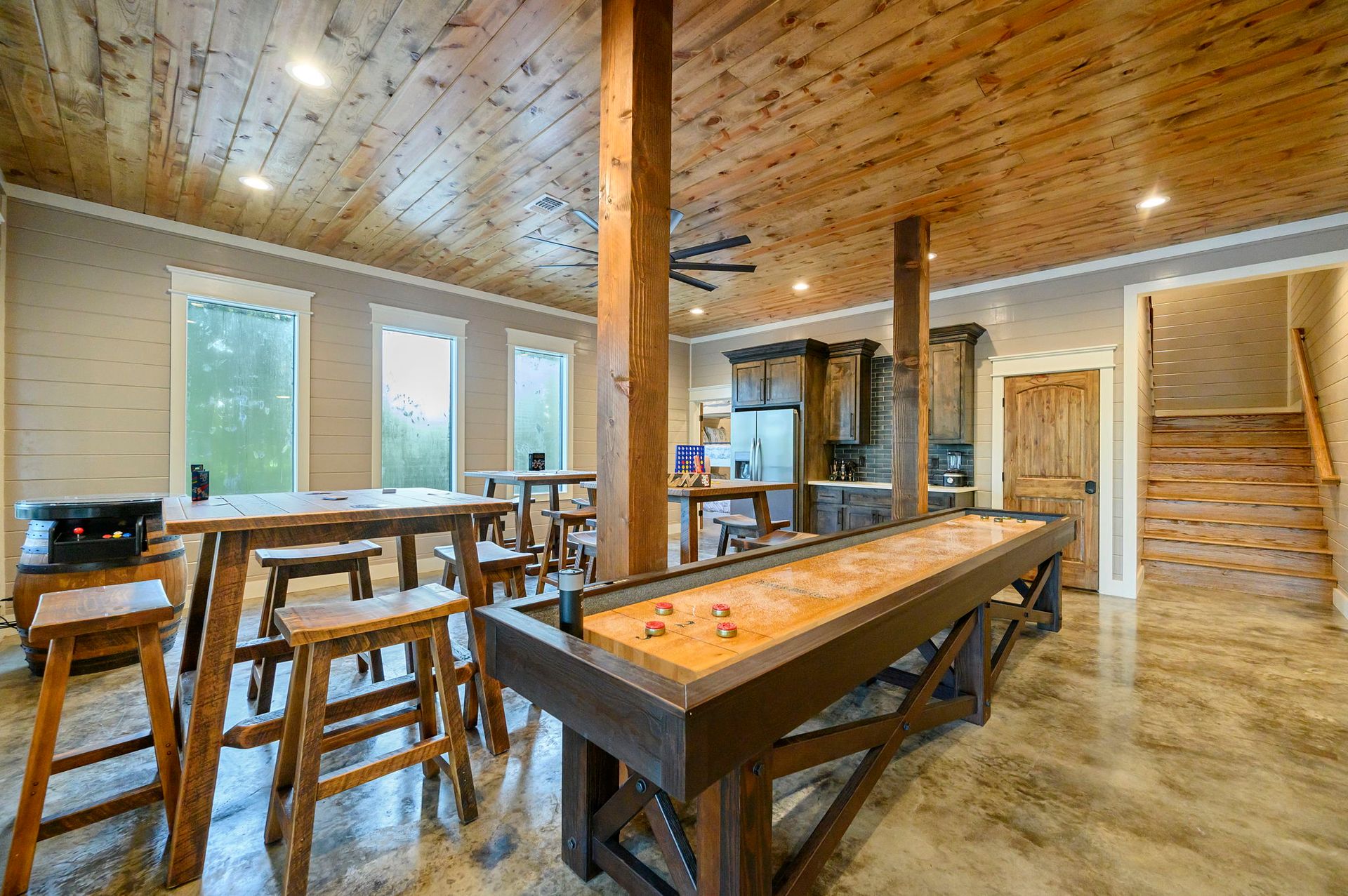 Descend to the basement level of Whiskey Trip and discover a true haven of fun and comfort. Here, reclining theater-style seating faces another gas fireplace and a massive TV, while a full second game area awaits, featuring a pool, shuffleboard, and an arcade table. The kitchenette, equipped with a full-size refrigerator and sink, ensures that everyone’s snacks and drinks are conveniently close at hand. You can step directly onto the poolside patio, where the sounds of laughter, splashing, and sizzling from the outdoor kitchen fill the air.