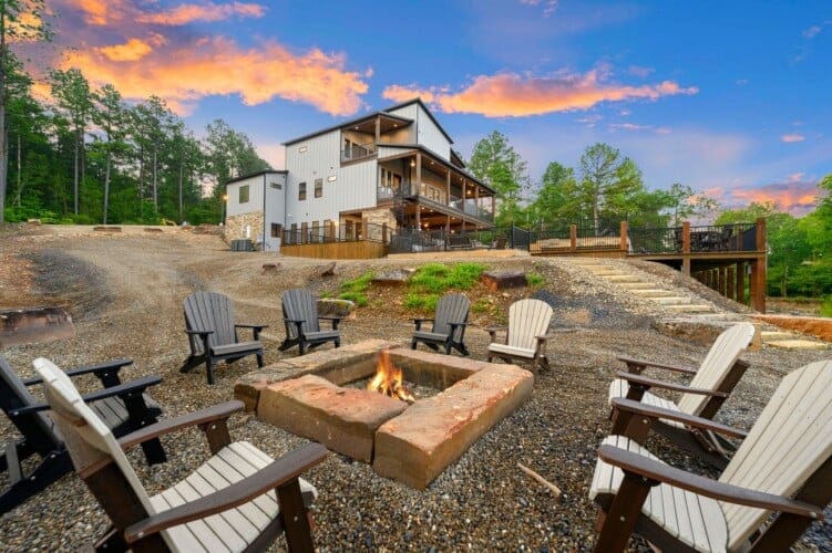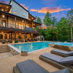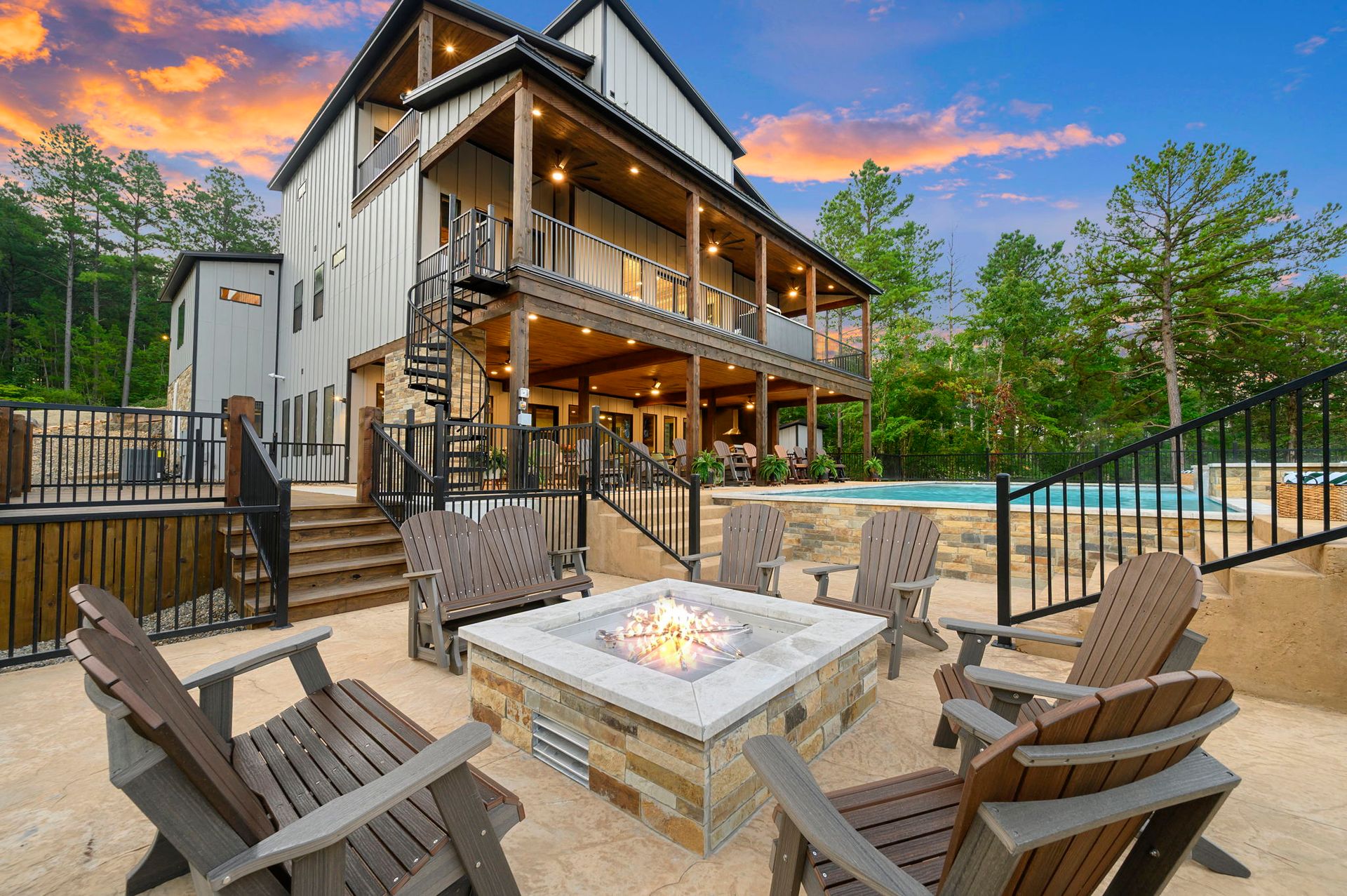 Welcome to Whiskey Trip, where modern design meets mountain charm in a space that feels tailor-made for making memories. This luxury 8-bedroom, 8.5-bathroom retreat in Broken Bow comfortably sleeps over 30 guests, offering a private pool, two hot tubs, three outdoor kitchens, and endless ways to unwind or play. Whether you’re hosting a multi-family reunion, a friends’ getaway, or a corporate retreat, Whiskey Trip is built to impress—with every amenity carefully curated for comfort, connection, and pure relaxation.