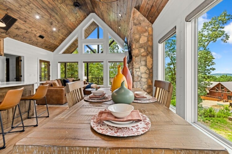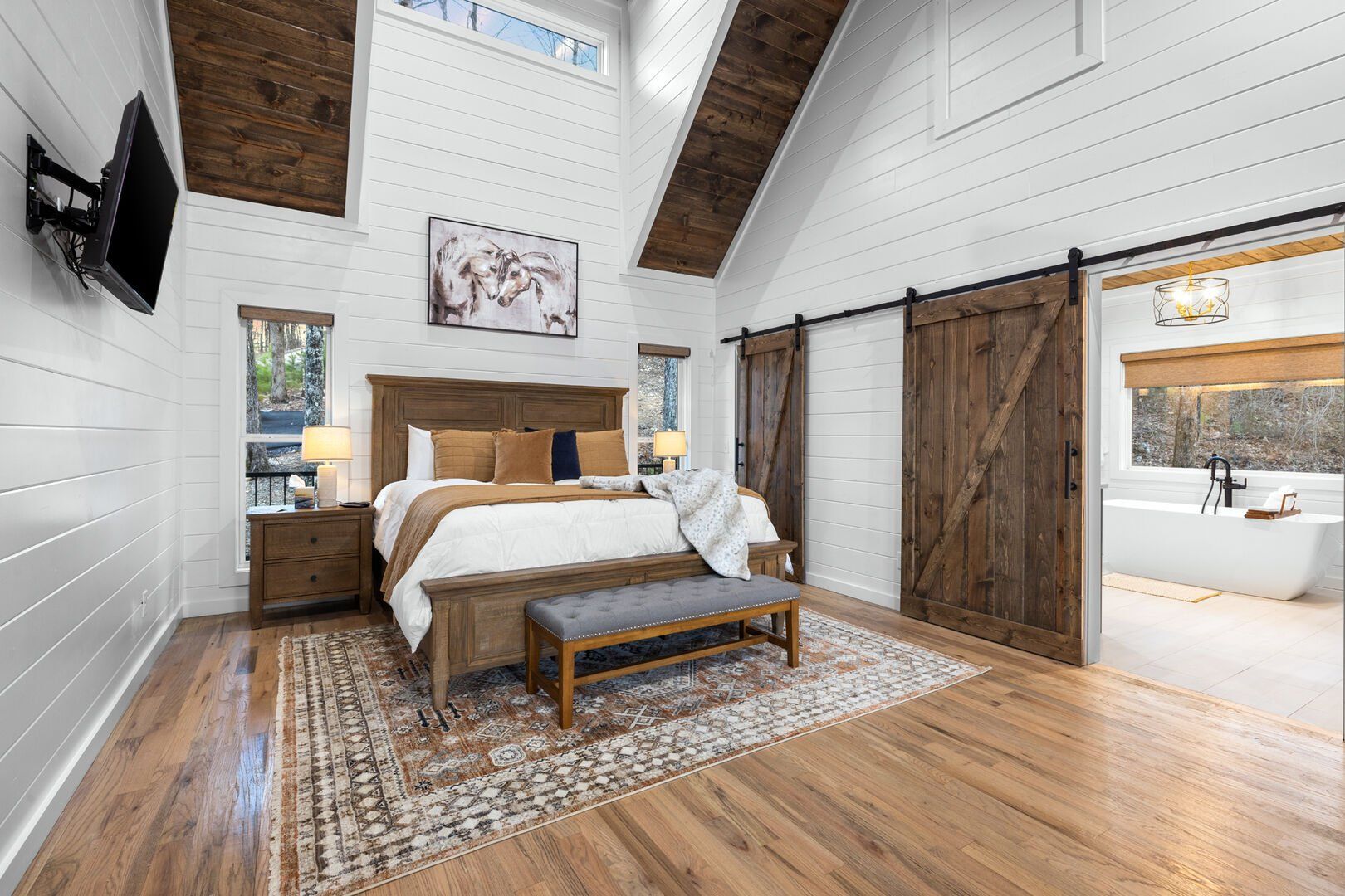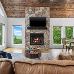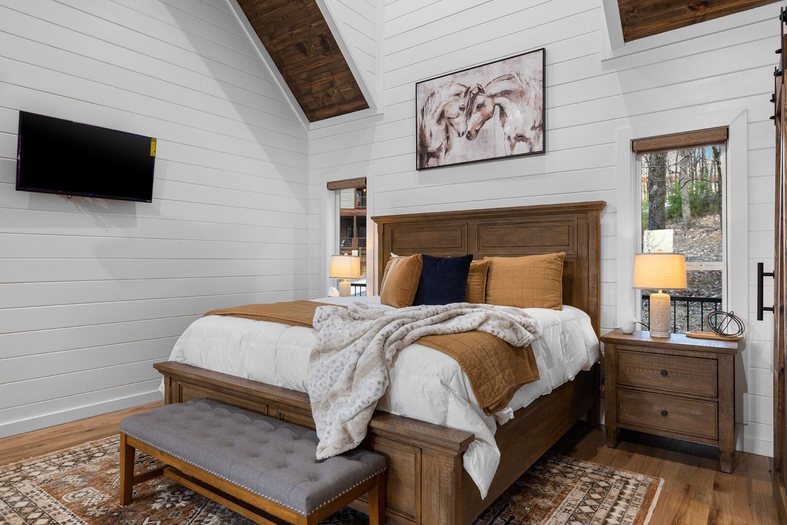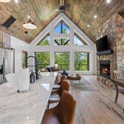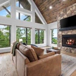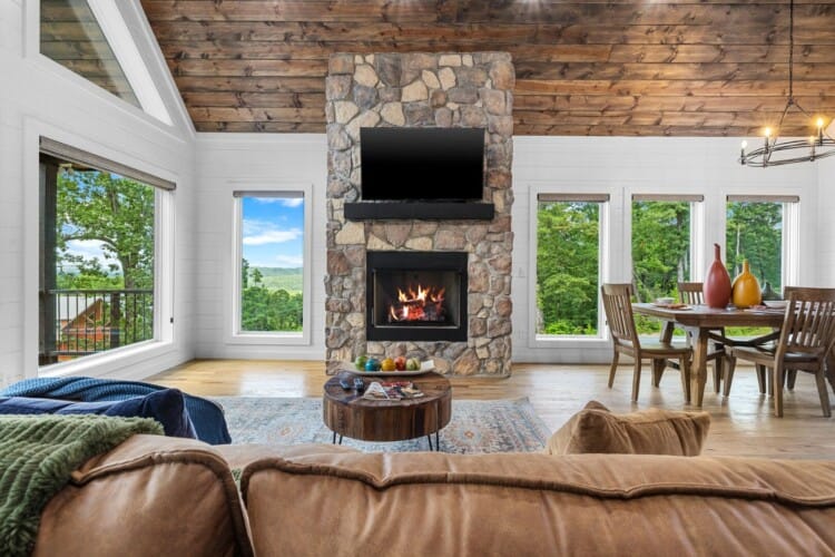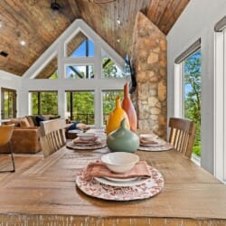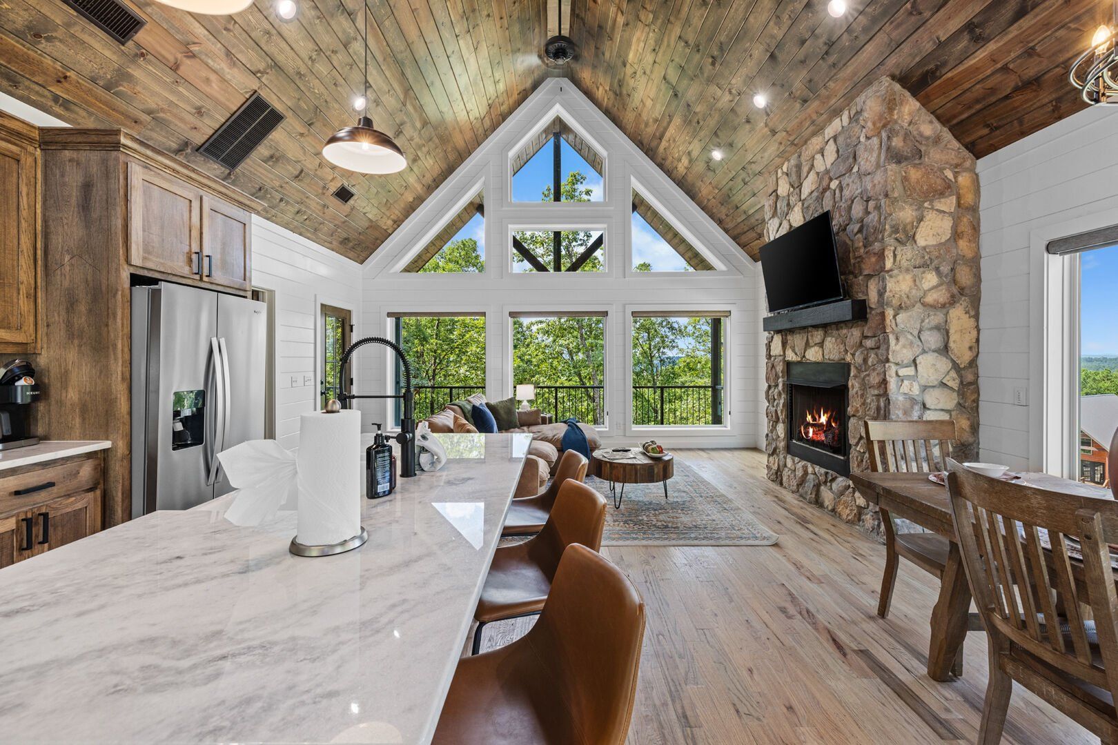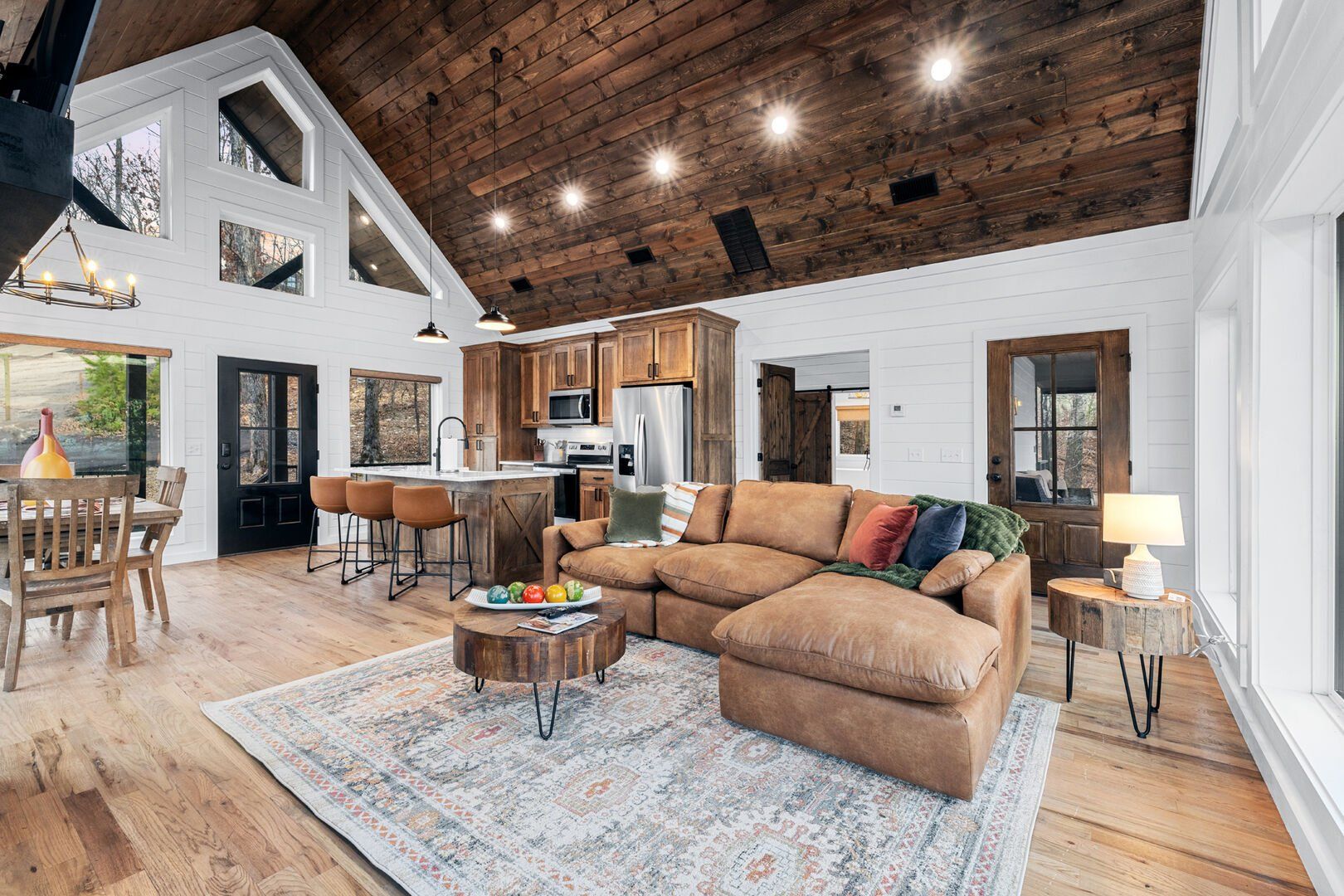 The main living area at White Horse is open, bright, and welcoming. Large windows let in soft natural light, and the wood finishes give the entire space a natural, cozy feel. The leather sofa faces a gas fireplace, perfect for warming up in the evenings or curling up with a cup of coffee first thing in the morning. Whether you’re catching up on your favorite show or simply enjoying the quiet, the living room offers just the right amount of comfort. High ceilings make the space feel open and airy, while touches like poufs and accent chairs add a personal touch.