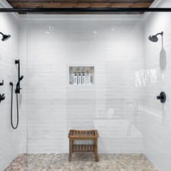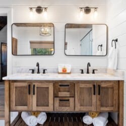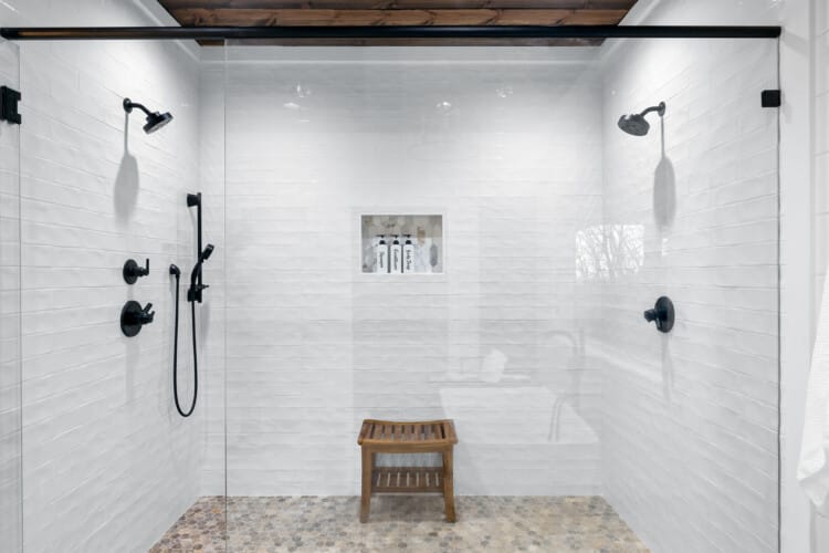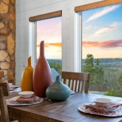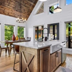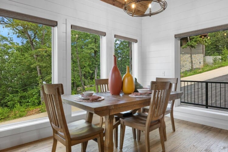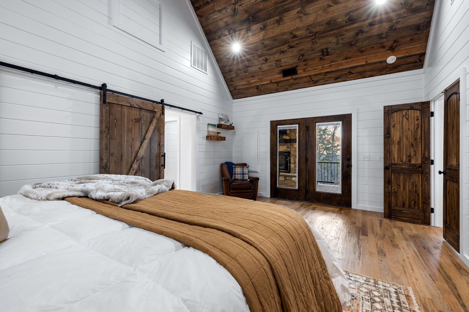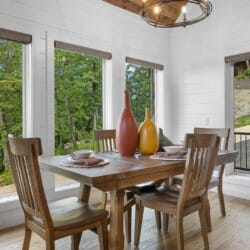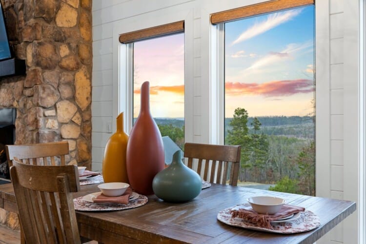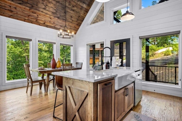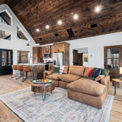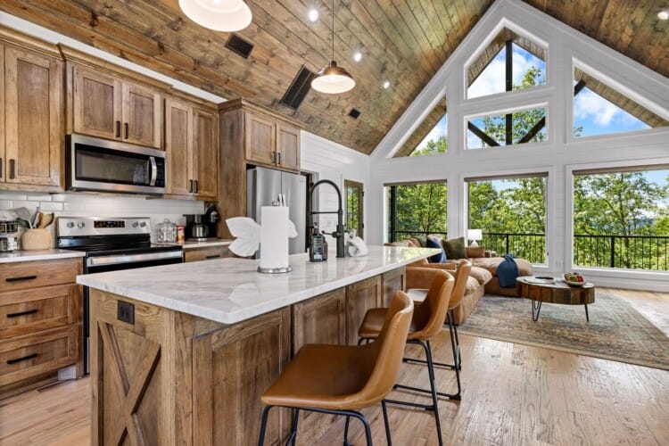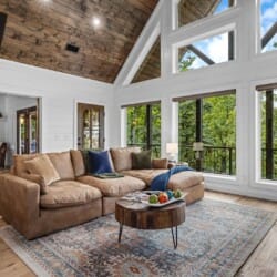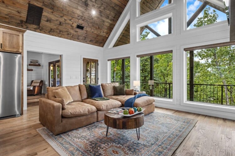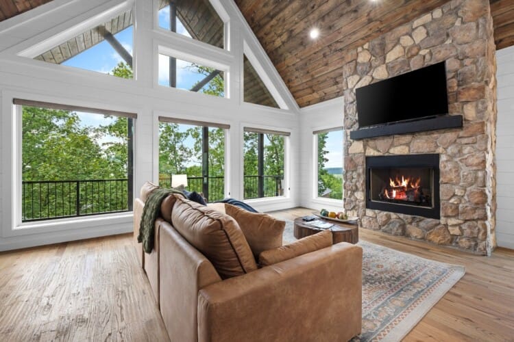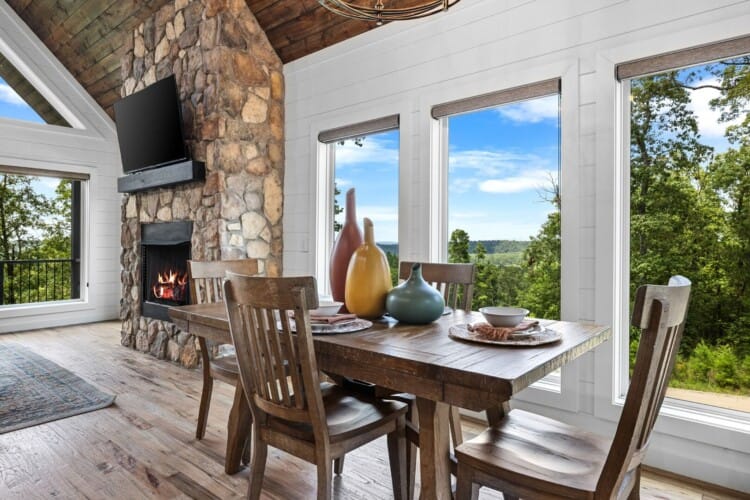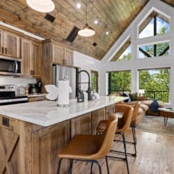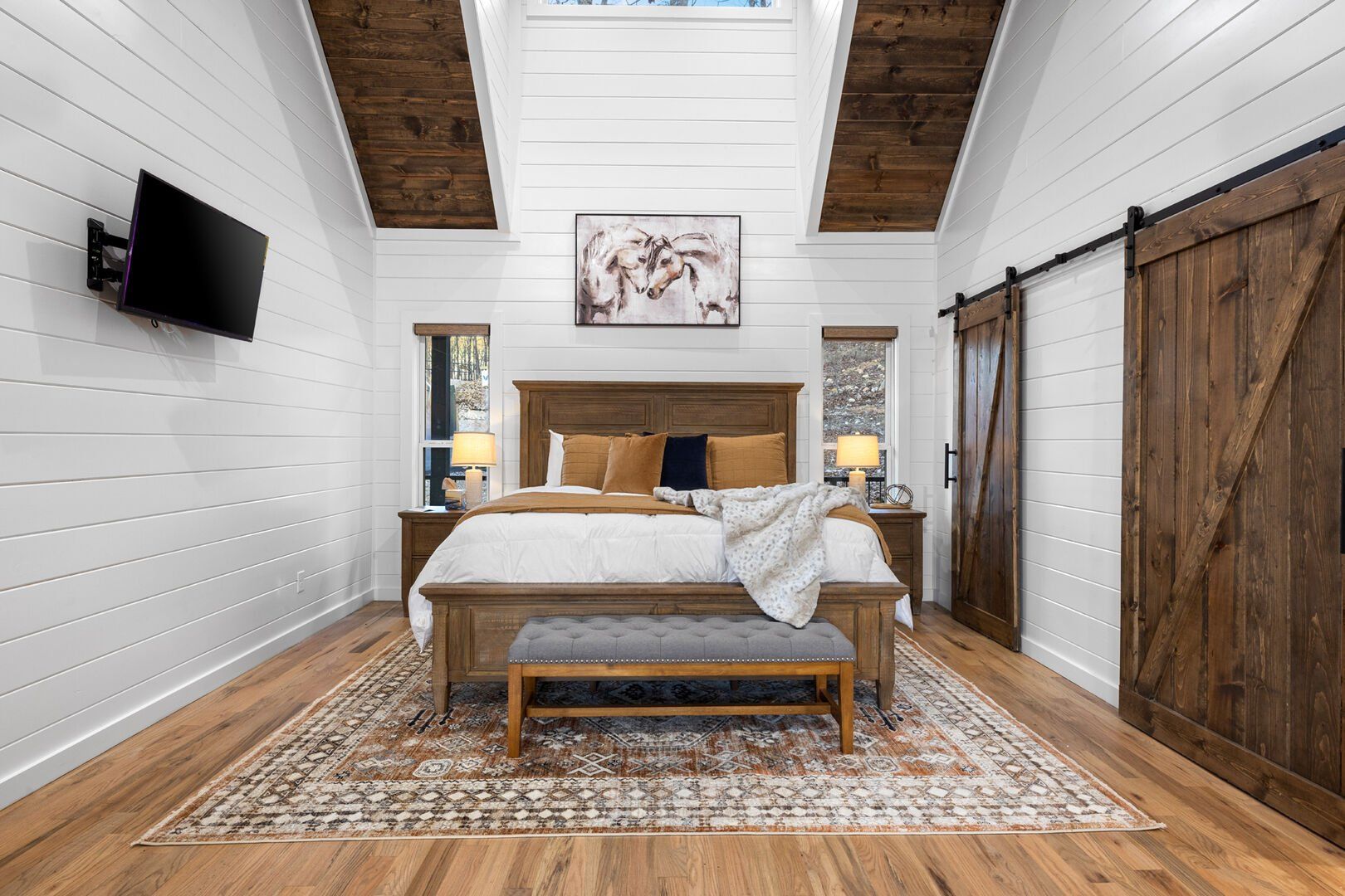 The main living area at White Horse is open, bright, and welcoming. Large windows let in soft natural light, and the wood finishes give the entire space a natural, cozy feel. The leather sofa faces a gas fireplace, perfect for warming up in the evenings or curling up with a cup of coffee first thing in the morning. Whether you’re catching up on your favorite show or simply enjoying the quiet, the living room offers just the right amount of comfort. High ceilings make the space feel open and airy, while touches like poufs and accent chairs add a personal touch.