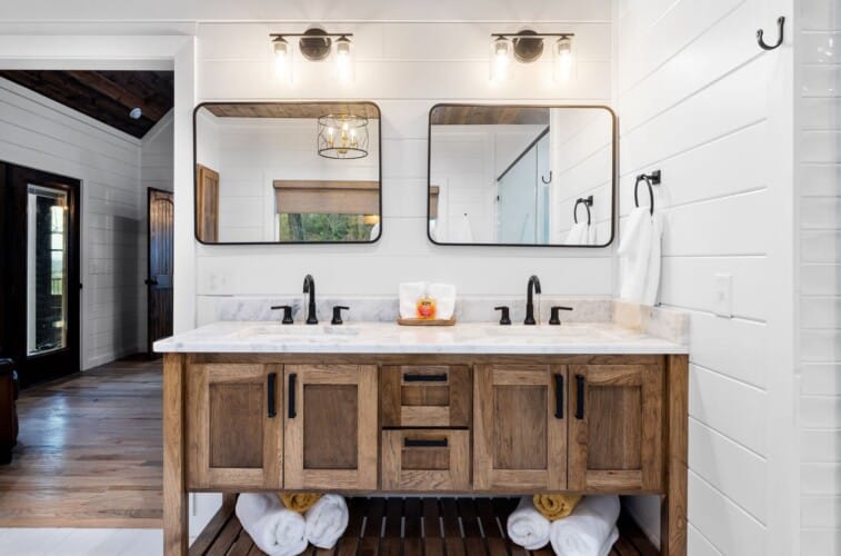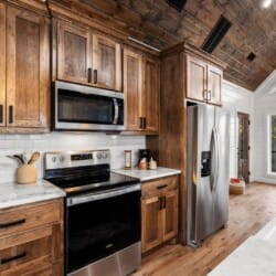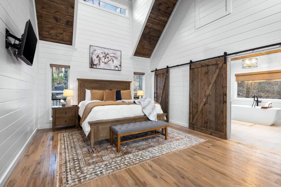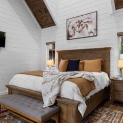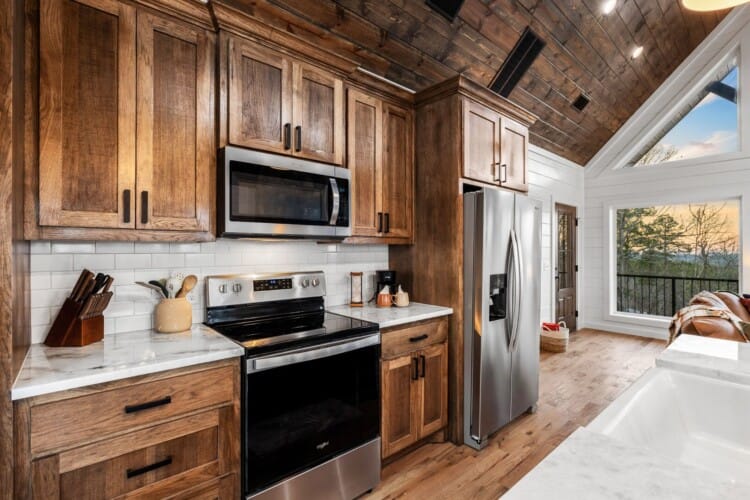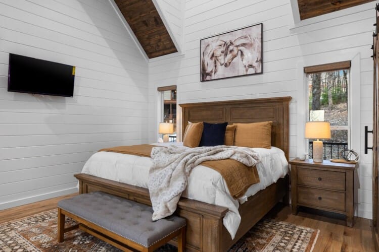 The kitchen at White Horse is more than just a place to cook—it’s a space that encourages you to slow down and enjoy each step. With full-sized appliances and warm wood cabinets, it’s designed for both functionality and style. A Keurig coffee bar makes mornings easy, and the oversized fridge gives you plenty of room for groceries. You can prepare meals using the well-stocked cookware, and then sit down together at the farmhouse dining table or take your meal outside to the deck. With the breeze moving through the trees and birds singing nearby, even a simple breakfast can feel special.