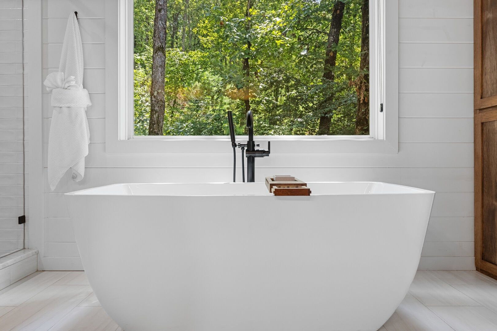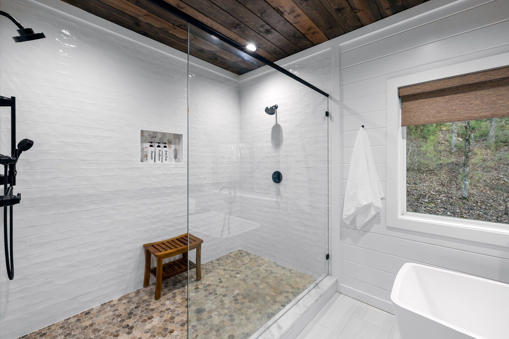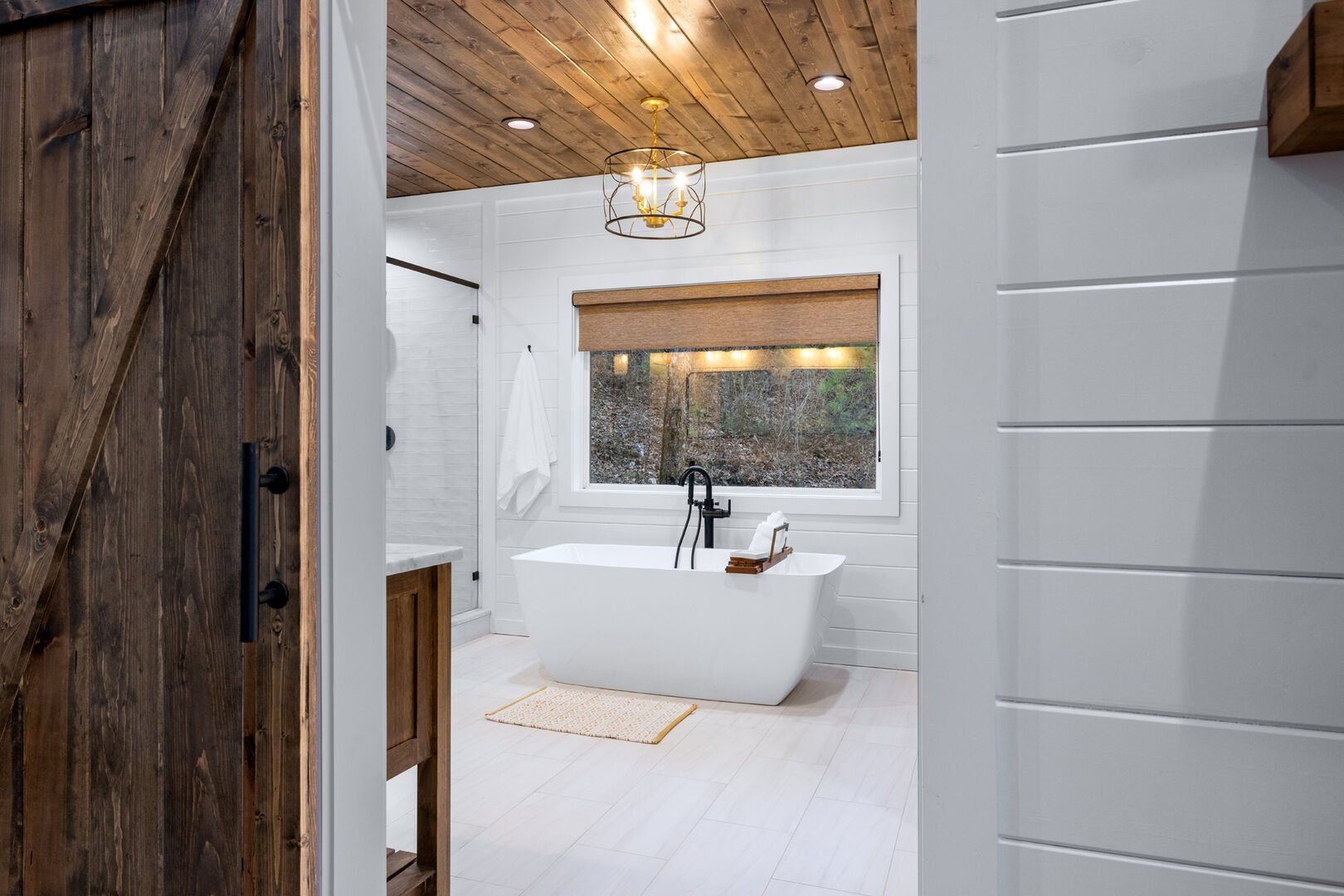 Upstairs, White Horse features a spacious primary bedroom that feels like a peaceful hideaway. The king-sized bed is soft and inviting, and large windows frame views of the surrounding woods. From this room, you can step directly out onto your private balcony or make your way to the beautifully designed ensuite bathroom. It’s the kind of space that invites you to unwind, soak, and forget about everything outside the forest.