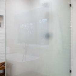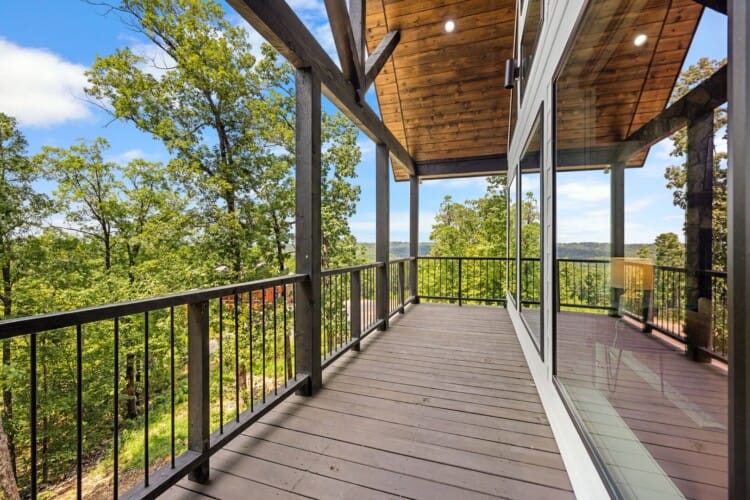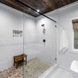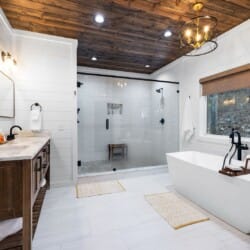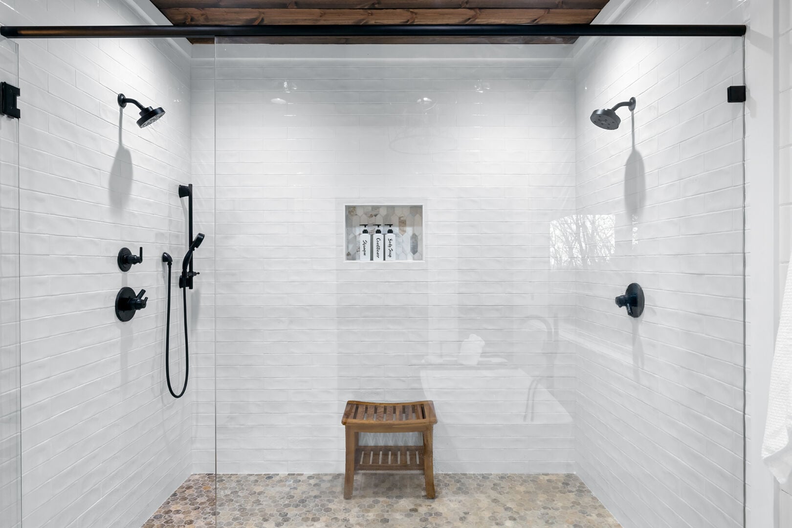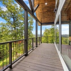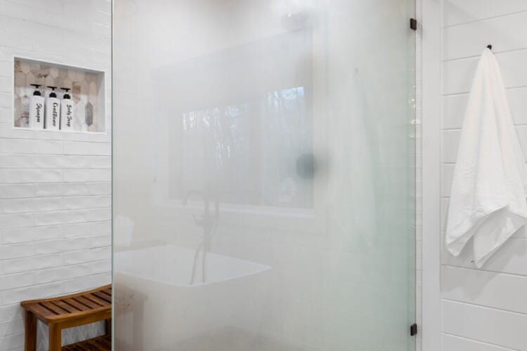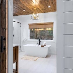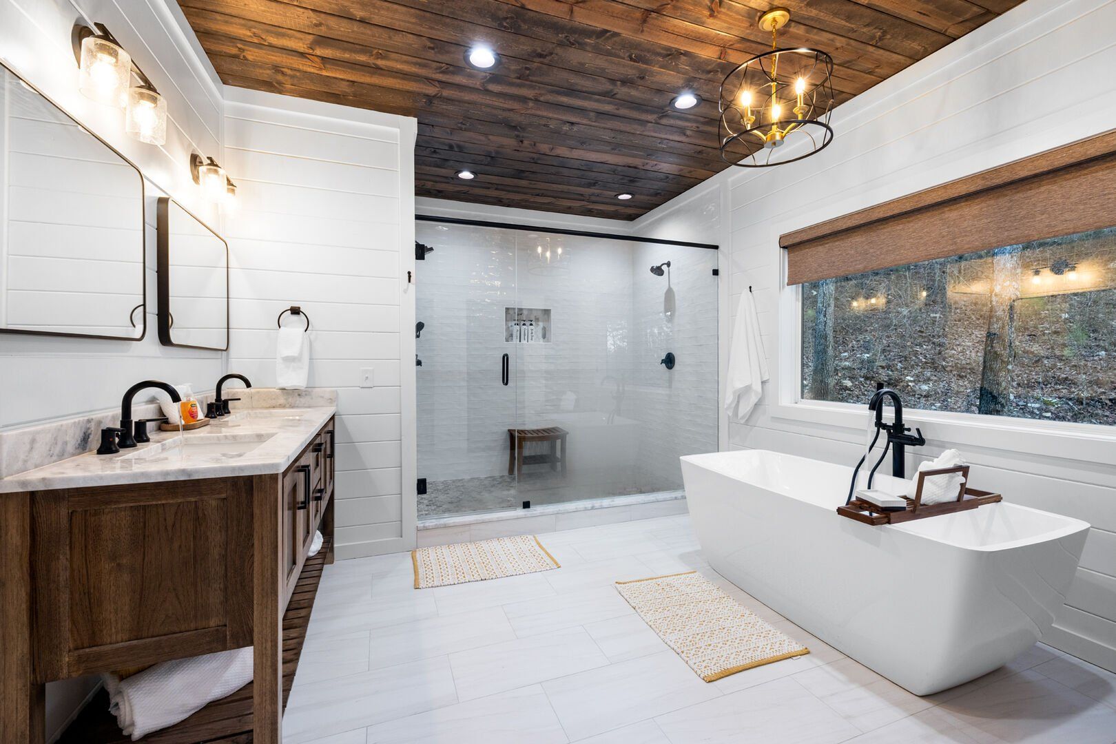 Upstairs, White Horse features a spacious primary bedroom that feels like a peaceful hideaway. The king-sized bed is soft and inviting, and large windows frame views of the surrounding woods. From this room, you can step directly out onto your private balcony or make your way to the beautifully designed ensuite bathroom. It’s the kind of space that invites you to unwind, soak, and forget about everything outside the forest.