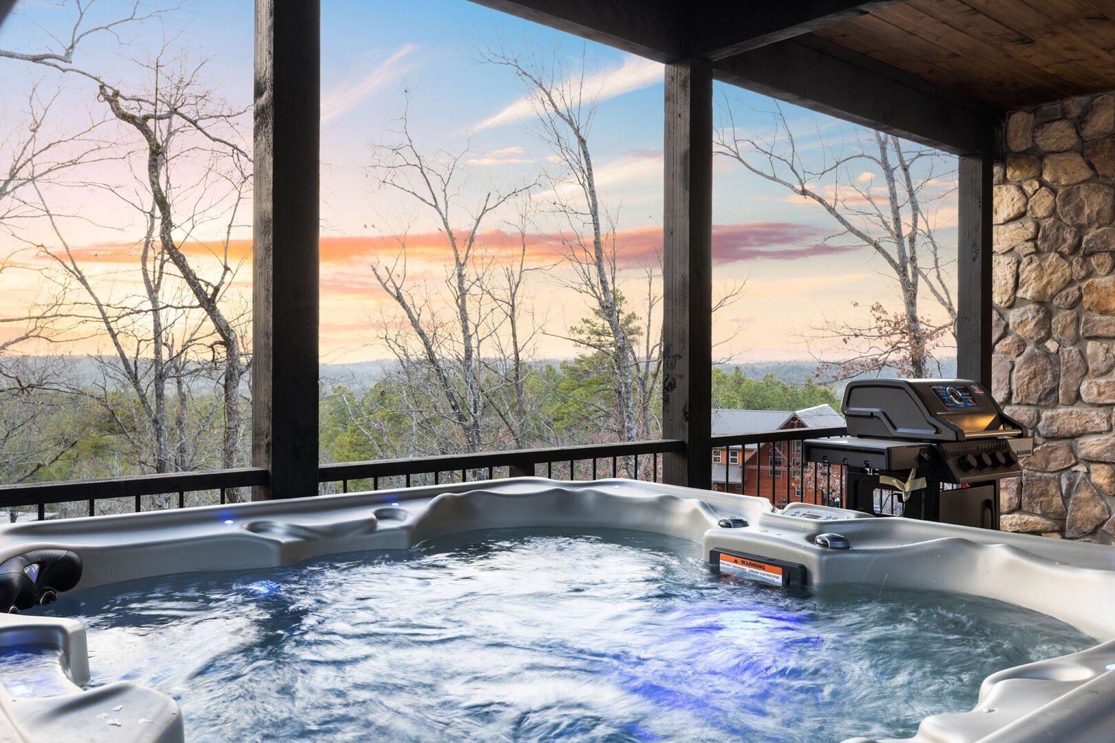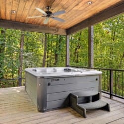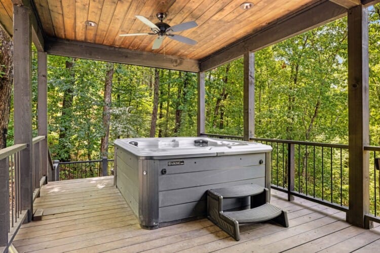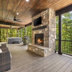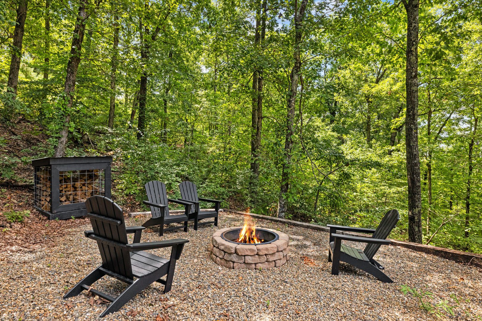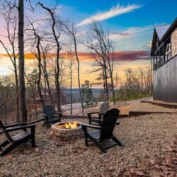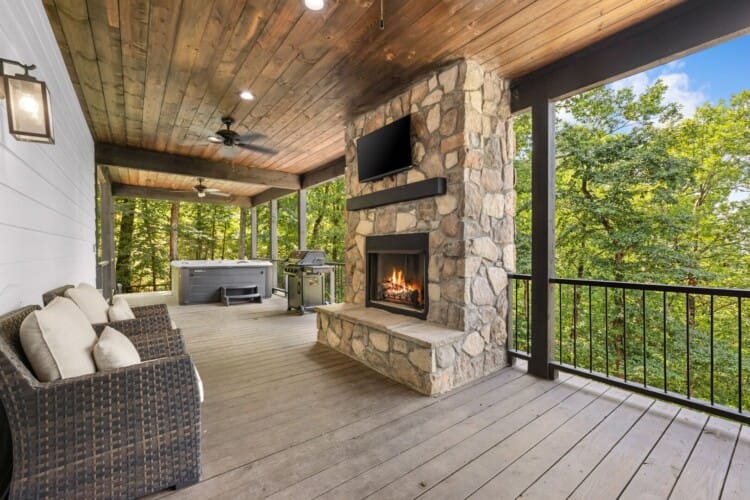 The outdoor space at White Horse is what truly sets it apart. The sprawling deck features ample seating, an outdoor dining table, and a grill that’s perfect for preparing easy meals. Just steps away, the gazebo-style hot tub glows softly at night, making it an ideal spot to end your day. There’s also a fire pit surrounded by string lights, where you can sit for hours sharing stories, making s’mores, or just enjoying the stars. The lit-up stairs between the deck and fire pit make getting around at night feel both safe and magical.