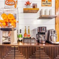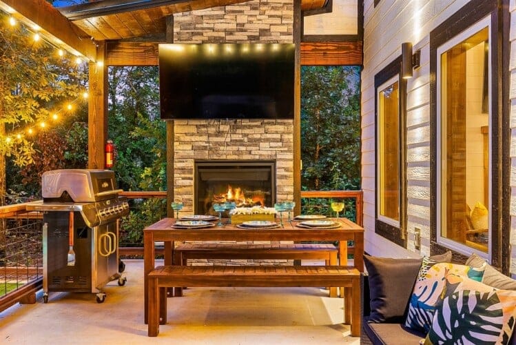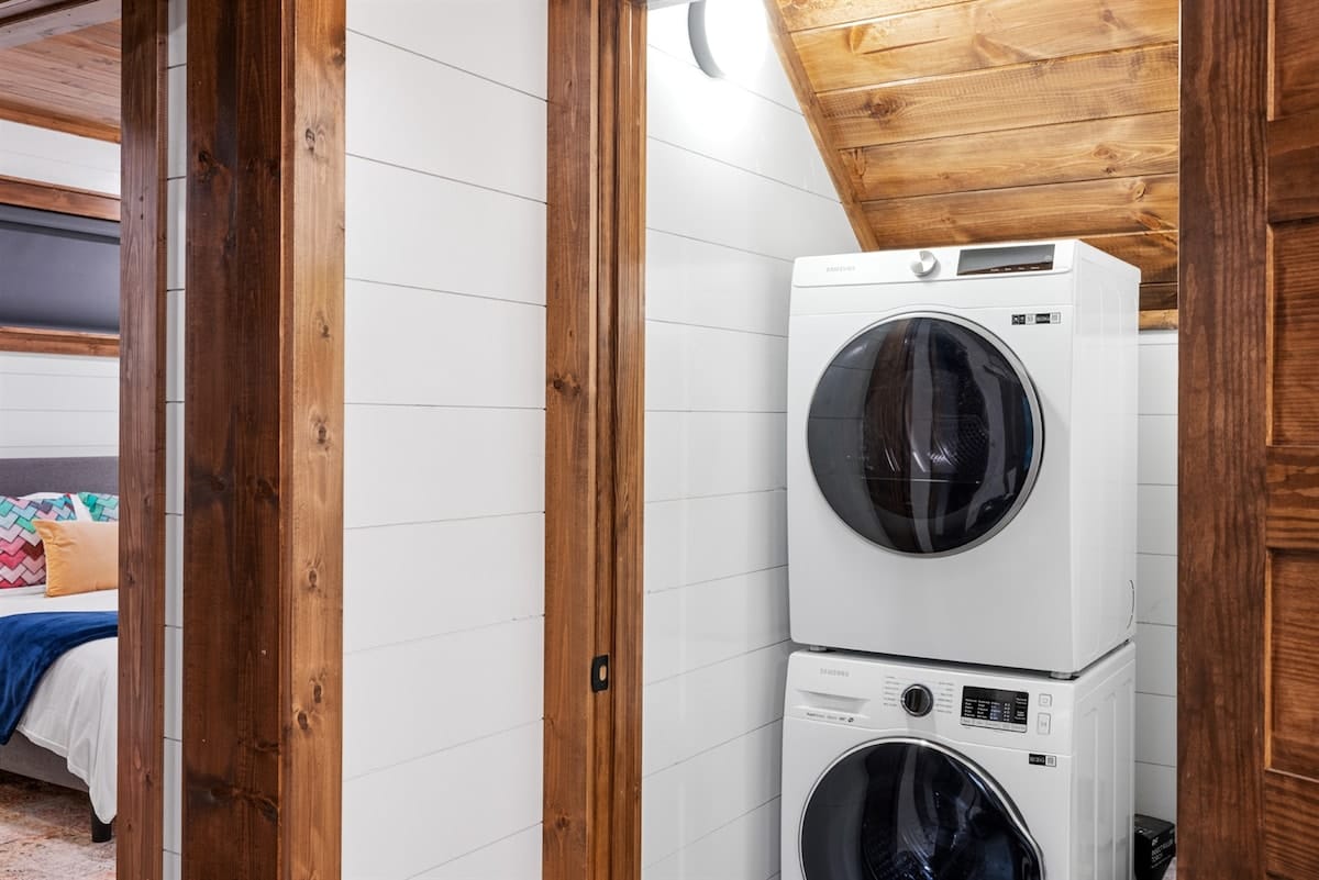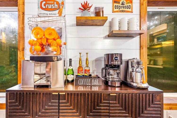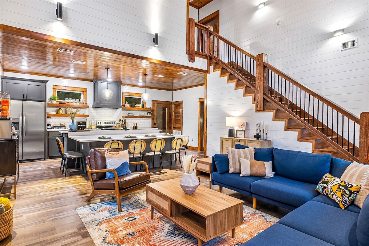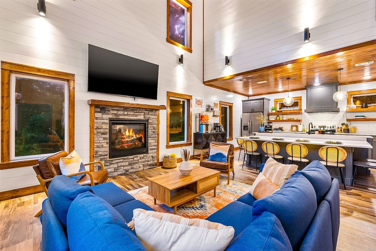 Indoor allure beckons with a two-story open floorplan featuring soaring ceilings, white shiplap, and a welcoming indoor fireplace. The living area boasts a Burrow Sectional Sofa, Smart TV, and family-friendly board games for cozy evenings. The fully equipped kitchen, adorned with a Nespresso Coffee Bar and juicer, invites culinary delights, while the dining table with seating for 8 becomes the heart of shared meals.