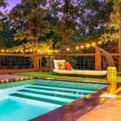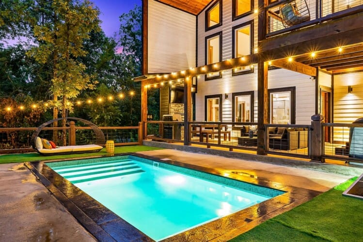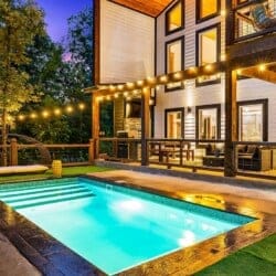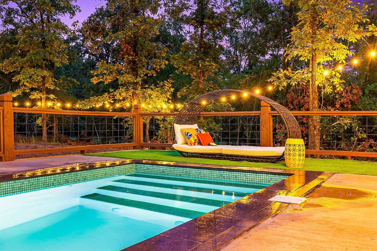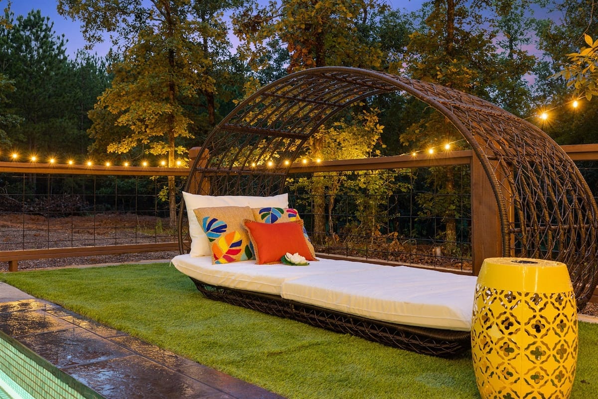 Step outdoors into a sprawling 2-acre haven featuring a modern resort-style pool, daybed cabana on turf, a six-person hot tub, Skyfort Playset, and a patio with a sectional couch and fireplace. Enjoy additional features like a playset and a firepit area, ensuring endless outdoor enjoyment.