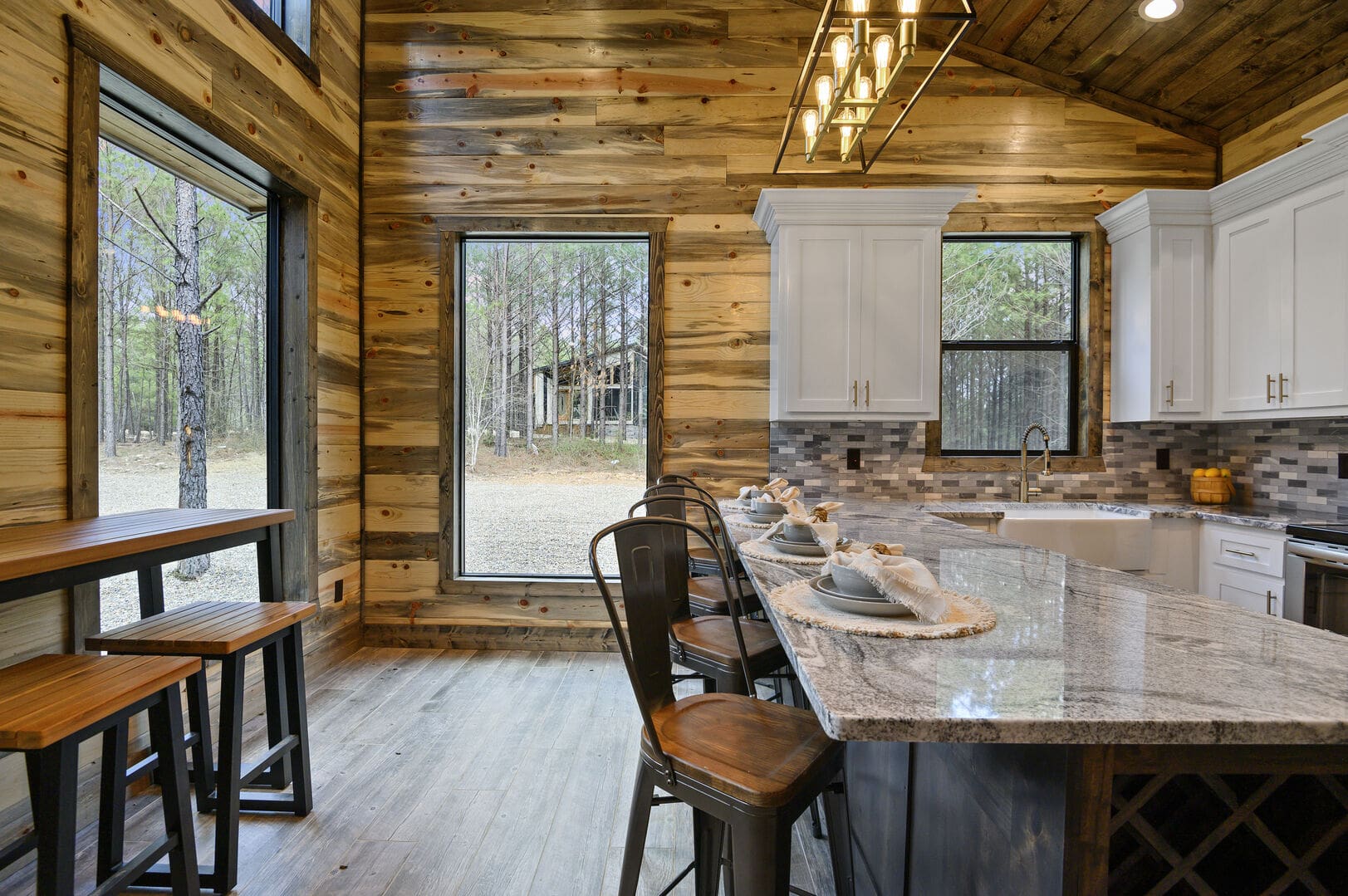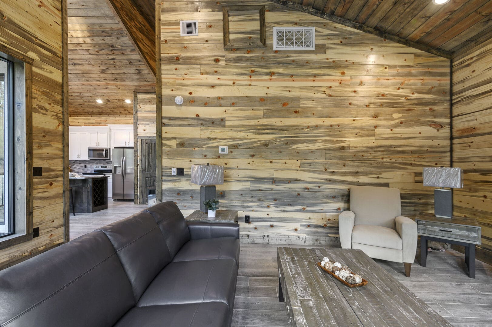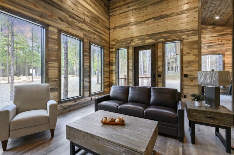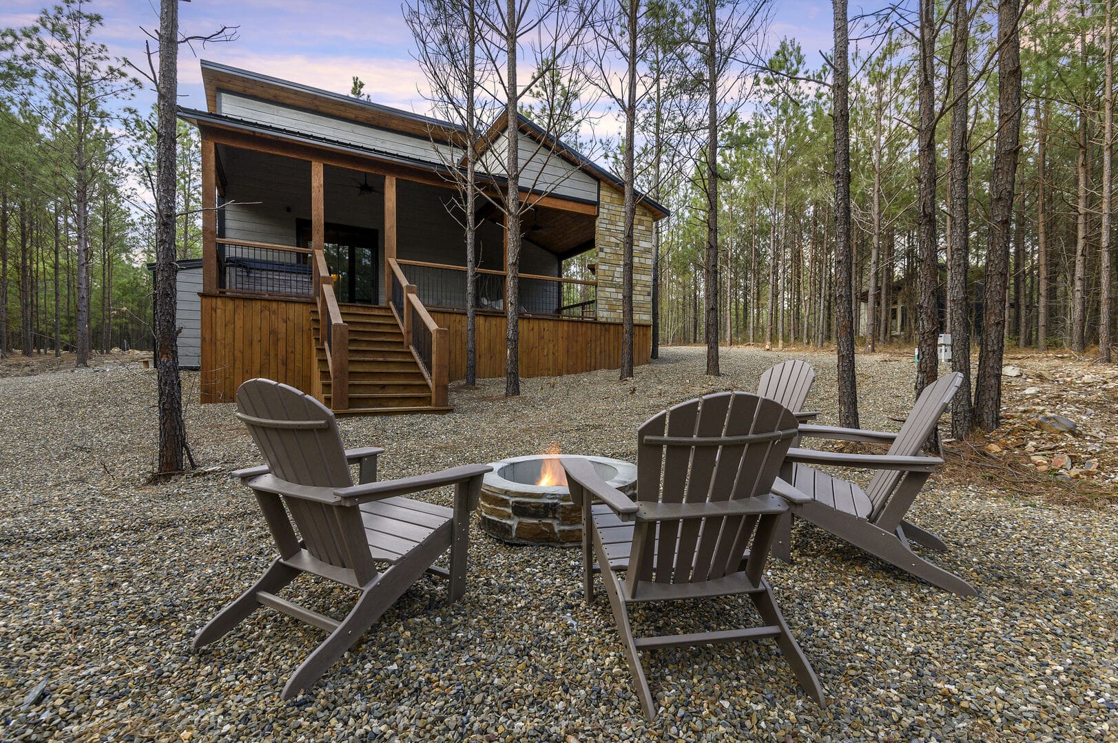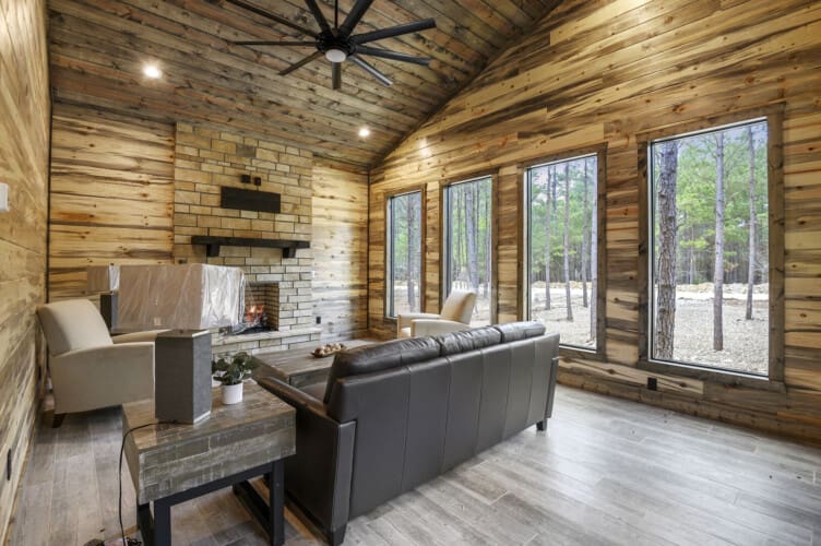 Imagine a romantic retreat at Whole Lotta Love cabin in Broken Bow. This intimate single-bedroom cabin is nestled amidst towering pine trees, ensuring a serene and private escape for you and your special someone. The full-service kitchen caters to your culinary desires and has all the necessary appliances. Bask in the natural light of the dining area as you savor your meals. The living room invites you to unwind with a leather sofa, two additional chairs, a gas fireplace, and a big-screen HDTV, setting the stage for cozy movie nights.