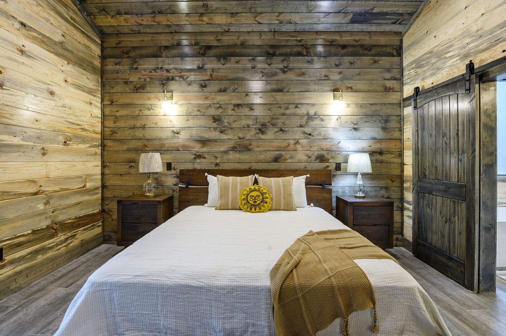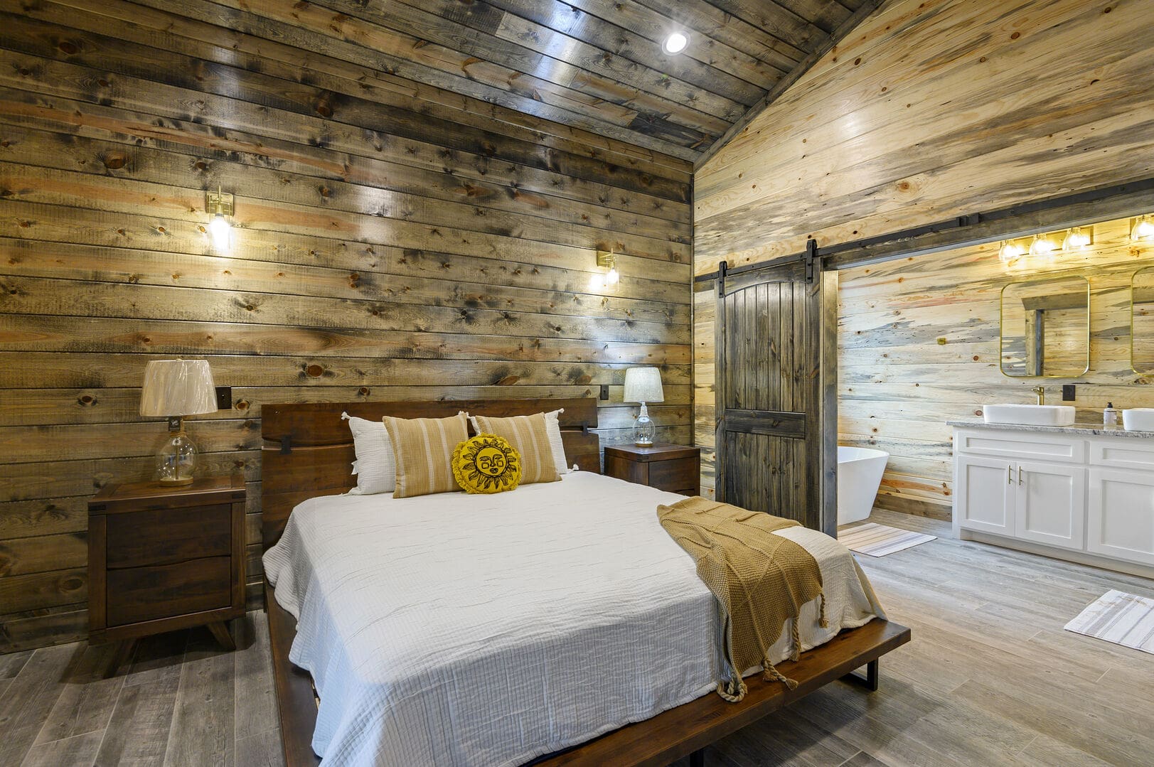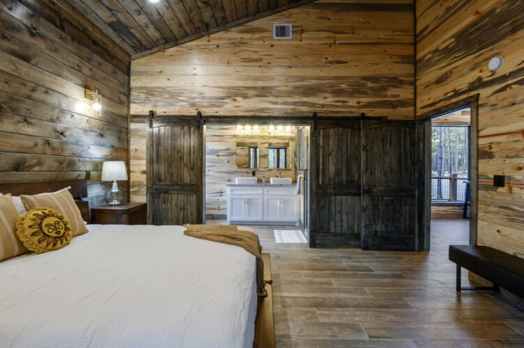 Indulge in the comfort of the bedroom, featuring a king-size bed, nightstands, a bench, a closet with hangers, and a big-screen HDTV. Easy access to the patio allows you to transition between indoor and outdoor spaces seamlessly. The ensuite bathroom enhances your retreat with double vanity sinks, a spacious soaker tub, and a walk-in shower equipped with double shower heads.