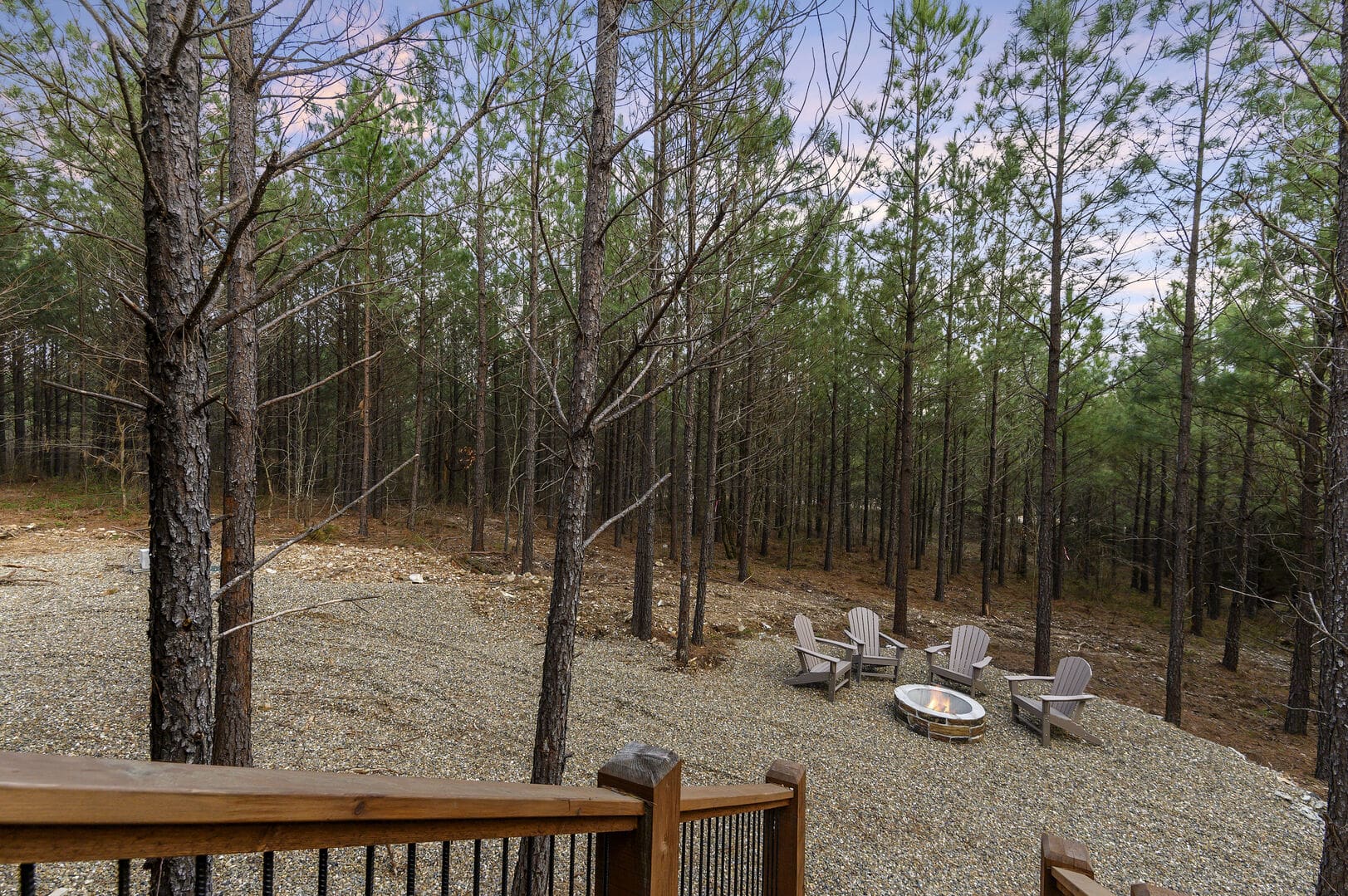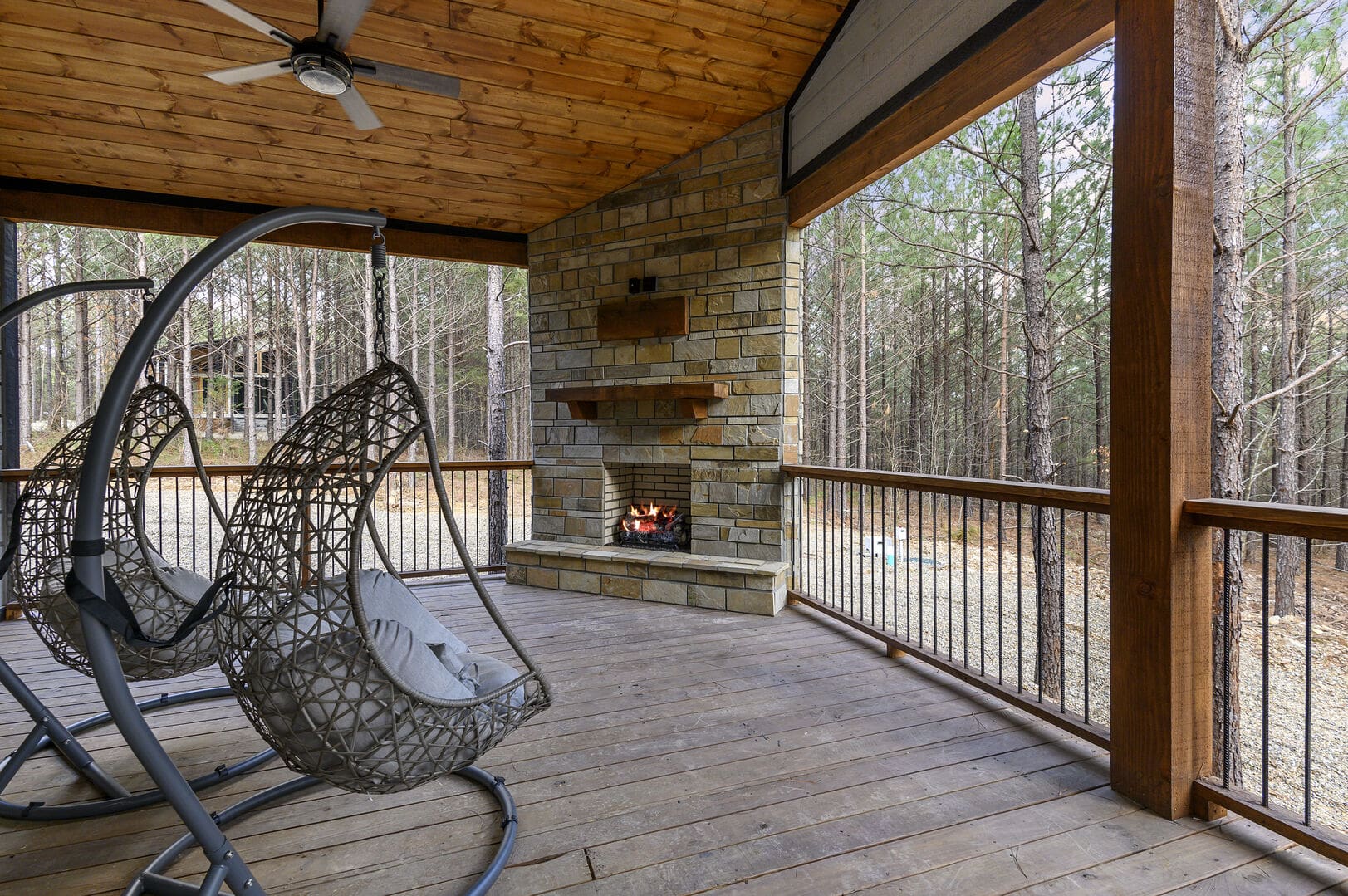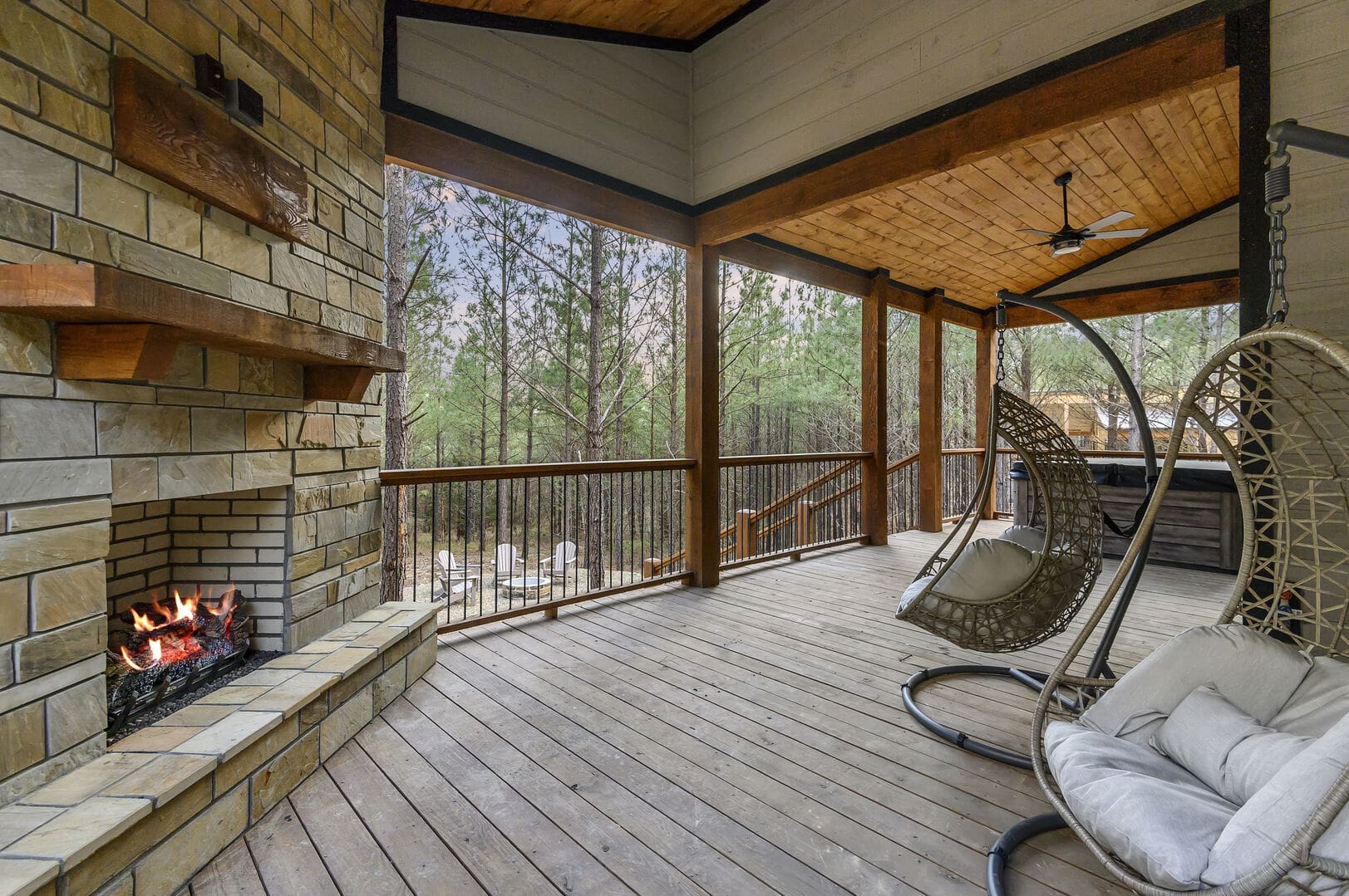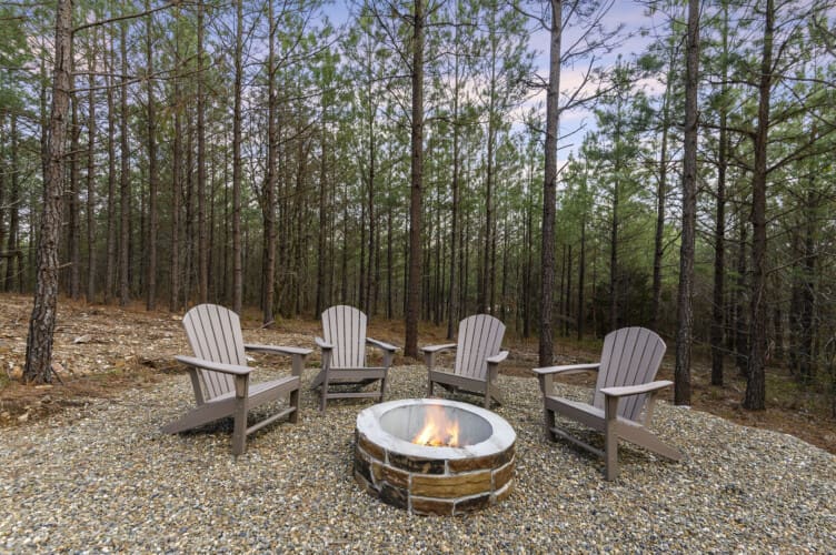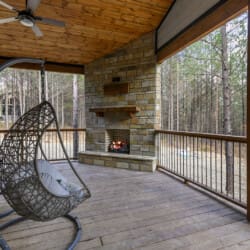 Step outside onto the deck to discover a private oasis. A hot tub beckons for relaxation, complemented by a fireplace and an outdoor TV, creating the perfect ambiance for unwinding. The patio furniture for two, swinging egg chairs, gas grill, and firepit with seating for four complete the outdoor living experience. Whether you choose to revel in peaceful seclusion or explore the offerings of Broken Bow, the Whole Lotta Love cabin ensures a memorable stay.