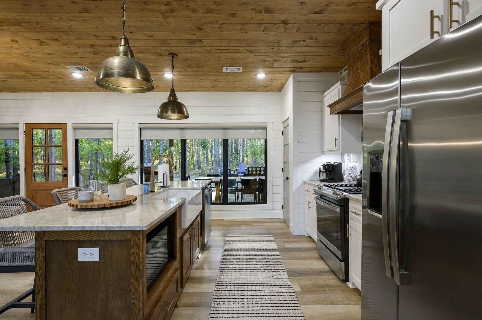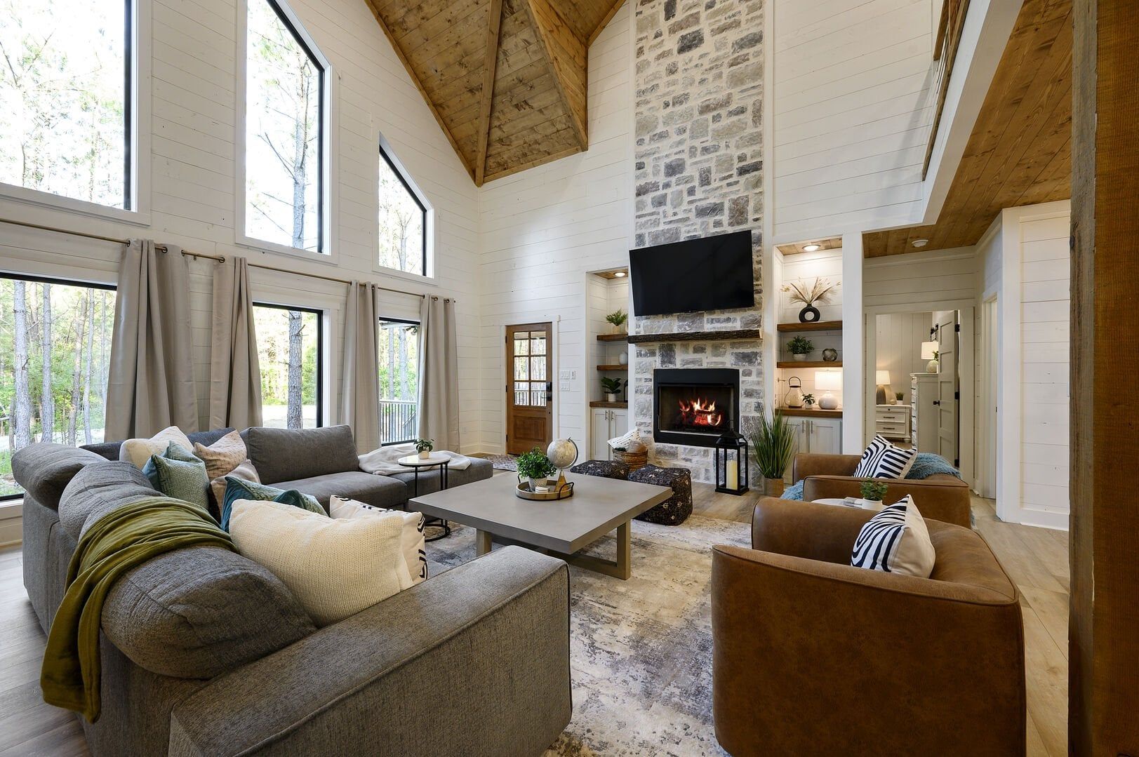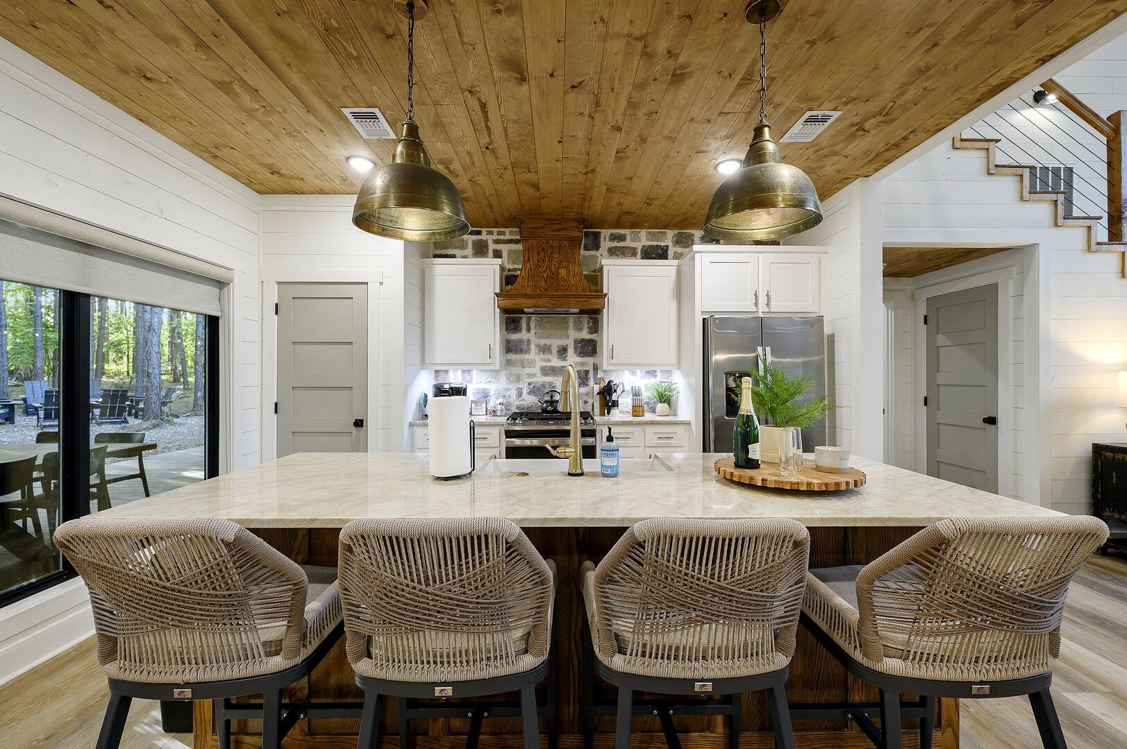 The main living area combines the kitchen, dining, and sitting spaces under a high ceiling with warm wooden floors and large windows. Guests will find relaxing on the soft sofa in front of the gas fireplace easy while enjoying a favorite show on the flat-screen HDTV. Natural light fills the room during the day, and the open layout allows everyone to stay connected, whether making snacks or playing board games. The living room leads straight to the deck, perfectly blending indoor and outdoor time.