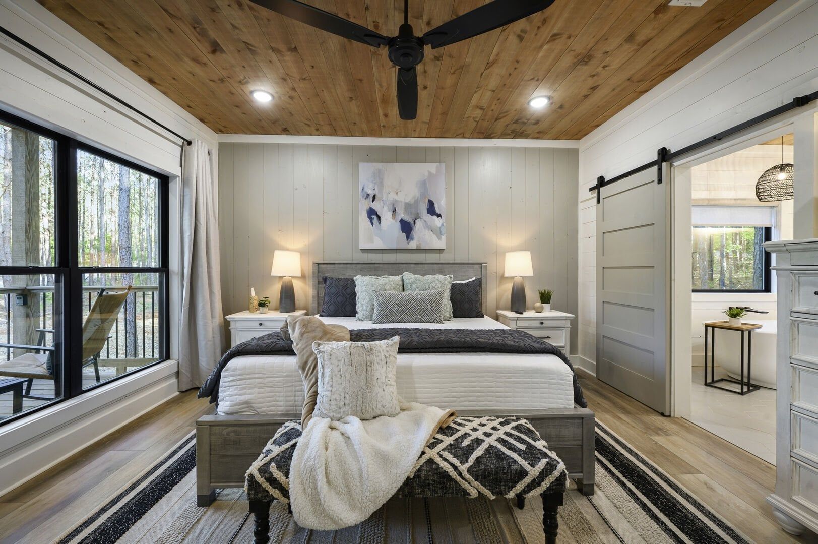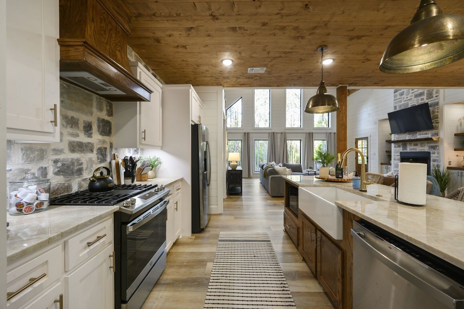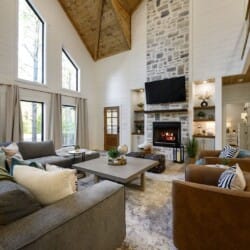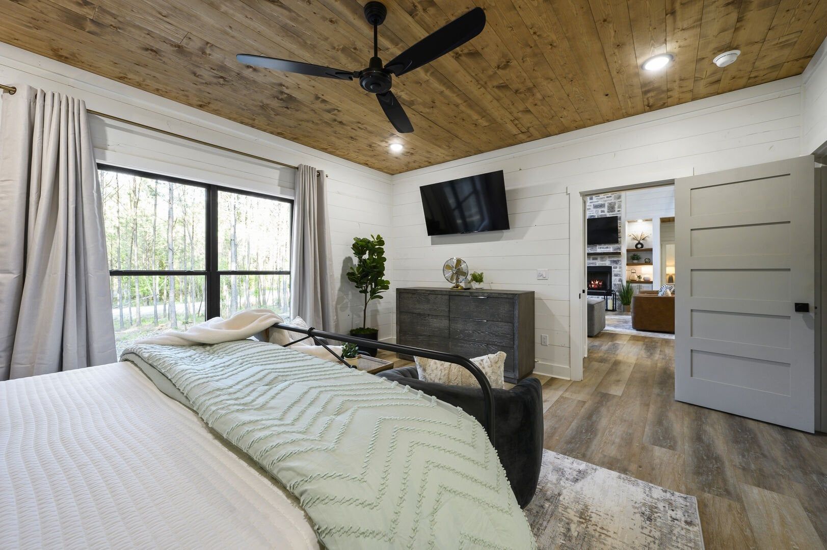 The main living area combines the kitchen, dining, and sitting spaces under a high ceiling with warm wooden floors and large windows. Guests will find relaxing on the soft sofa in front of the gas fireplace easy while enjoying a favorite show on the flat-screen HDTV. Natural light fills the room during the day, and the open layout allows everyone to stay connected, whether making snacks or playing board games. The living room leads straight to the deck, perfectly blending indoor and outdoor time.