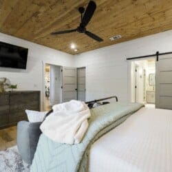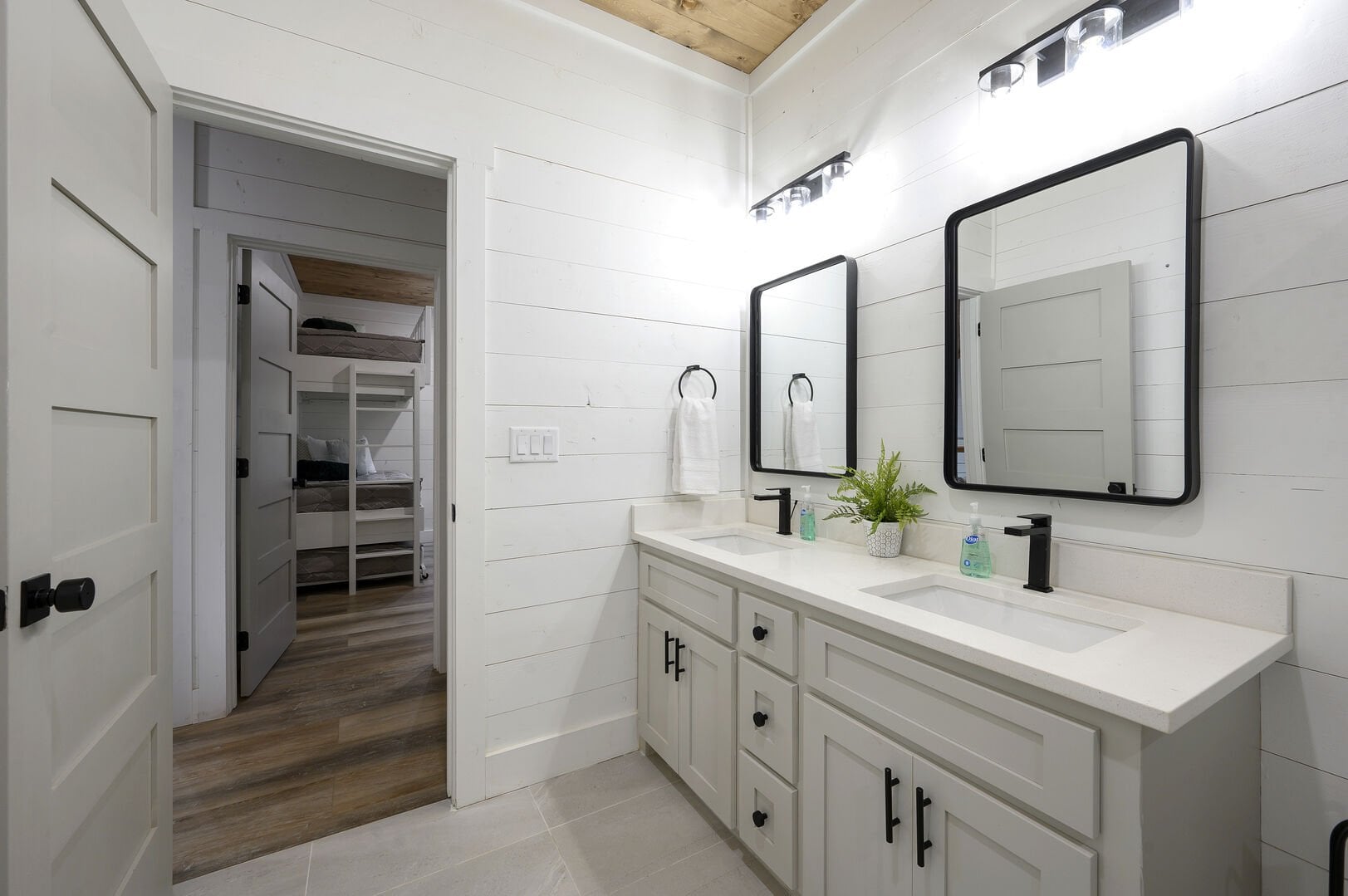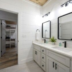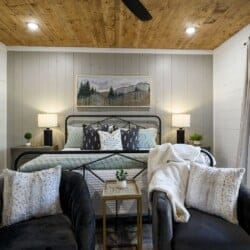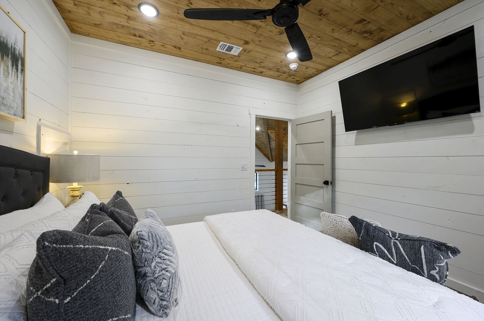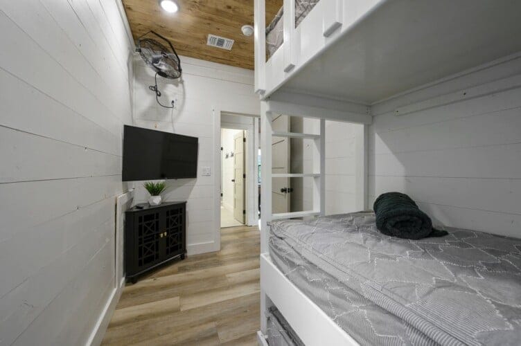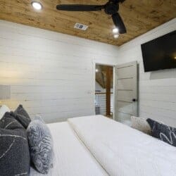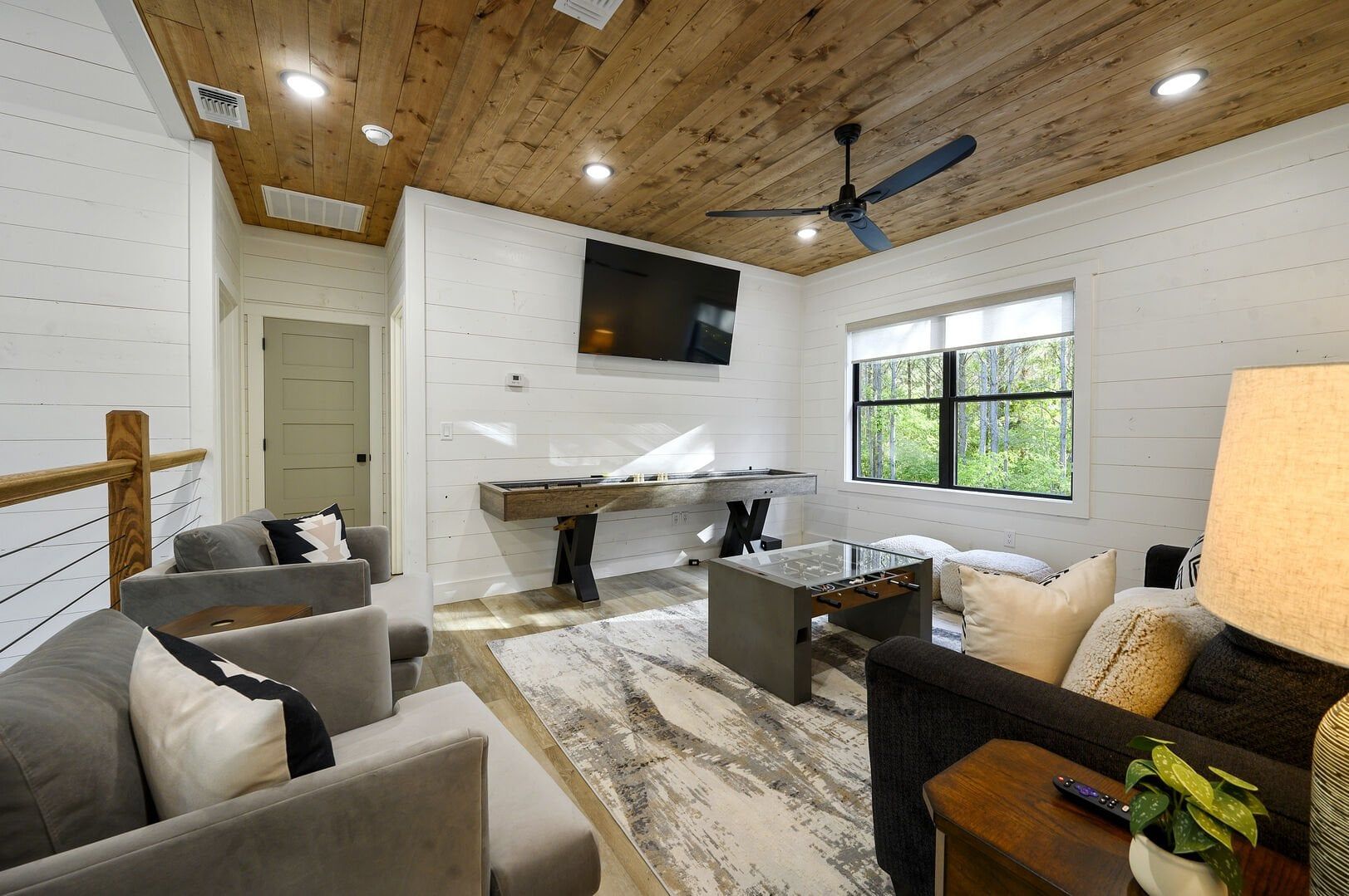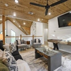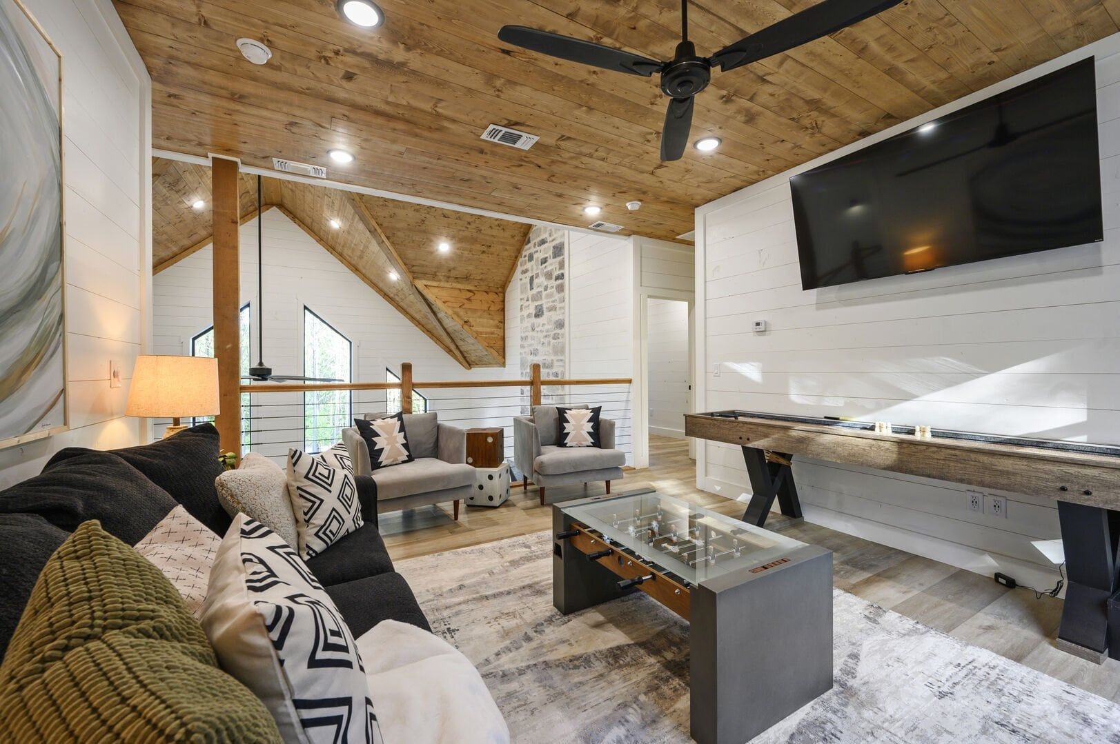 Three king bedrooms of Wildest Dreams offer private, quiet resting places, each furnished with Smart TVs and soft bedding. Two rooms are on the main floor, including ensuite bathrooms with stand-up showers and relaxing soaking tubs. The third king bedroom sits upstairs and shares a full bathroom in the hallway, serving the nearby bunk room and loft area. The bunk room, designed with kids or young adults in mind, features two twin beds and easy access to the upstairs bathroom, giving every guest space and privacy. The upstairs game loft includes a shuffleboard table, foosball, a sitting area, and a sleeper sofa, making it the perfect hangout for games or reading.