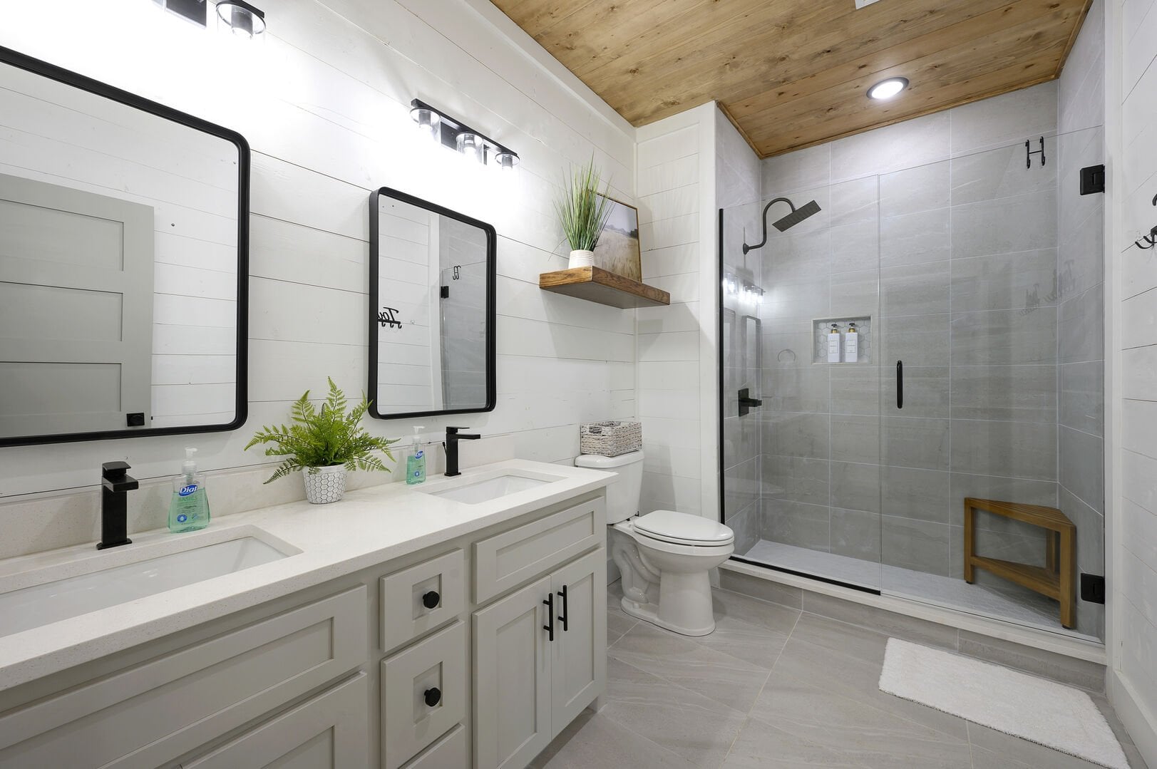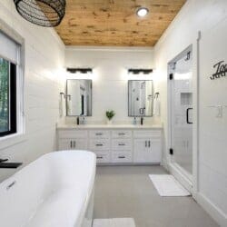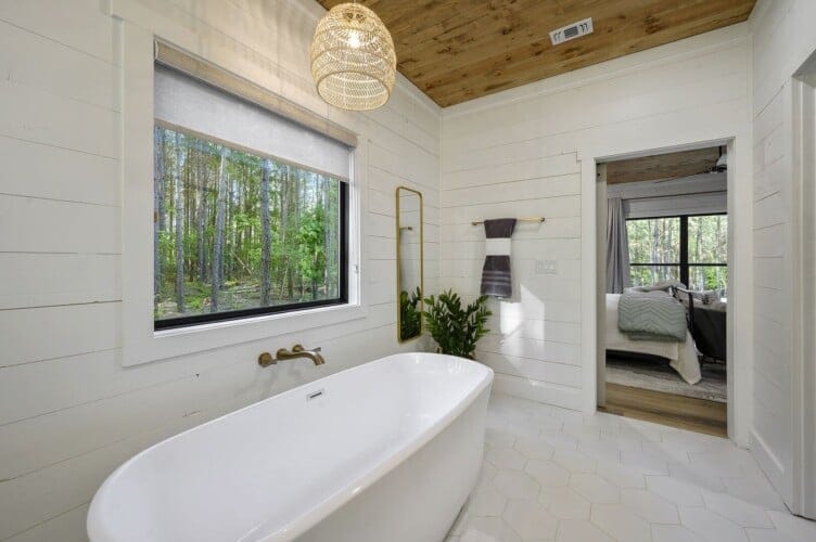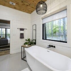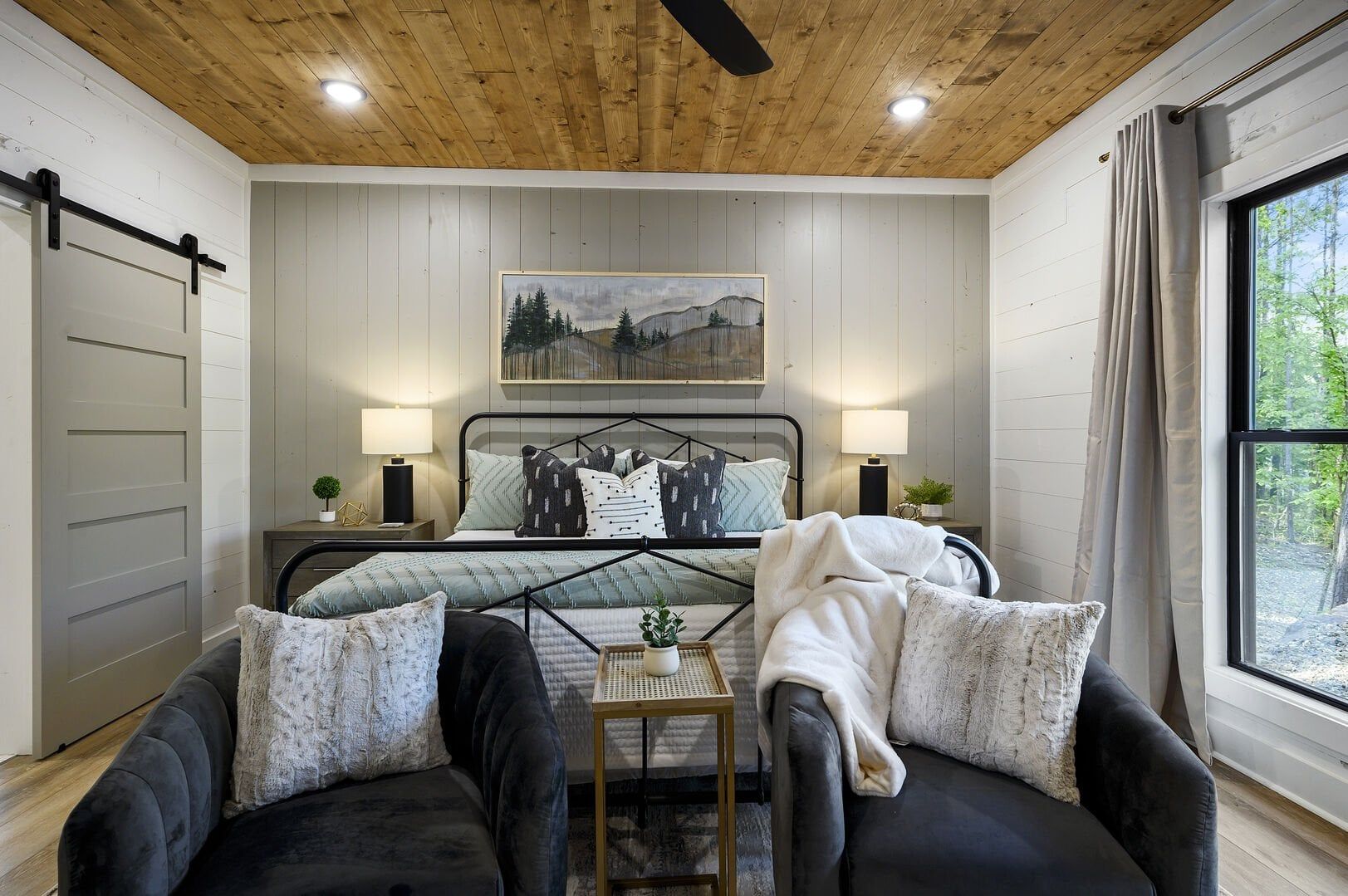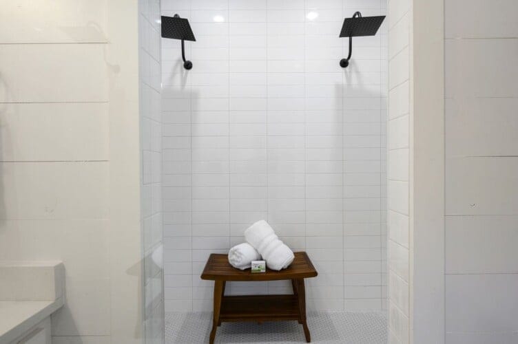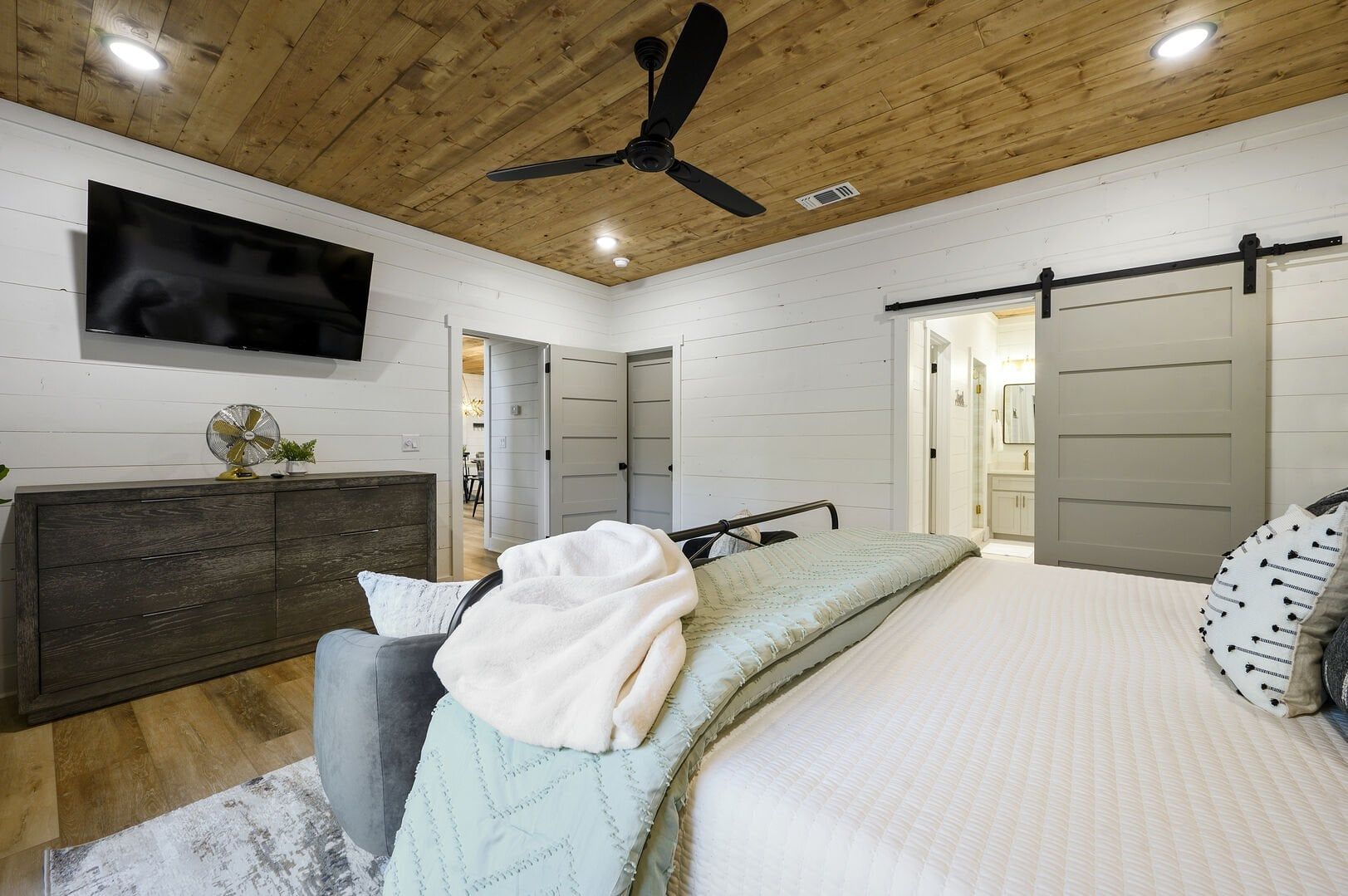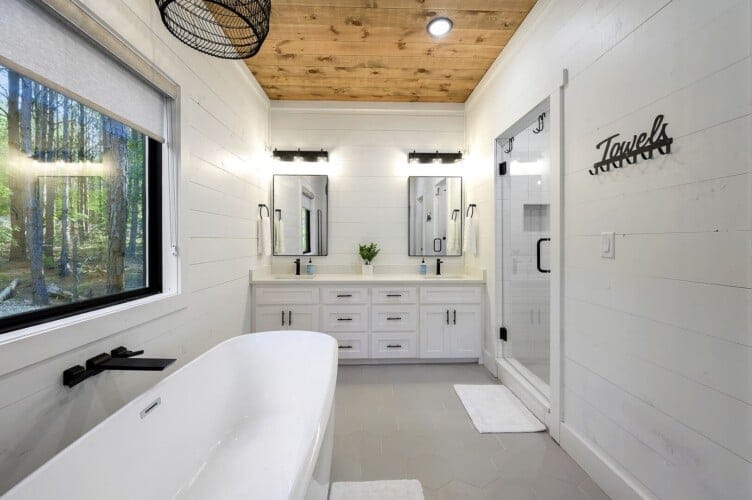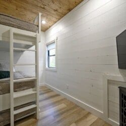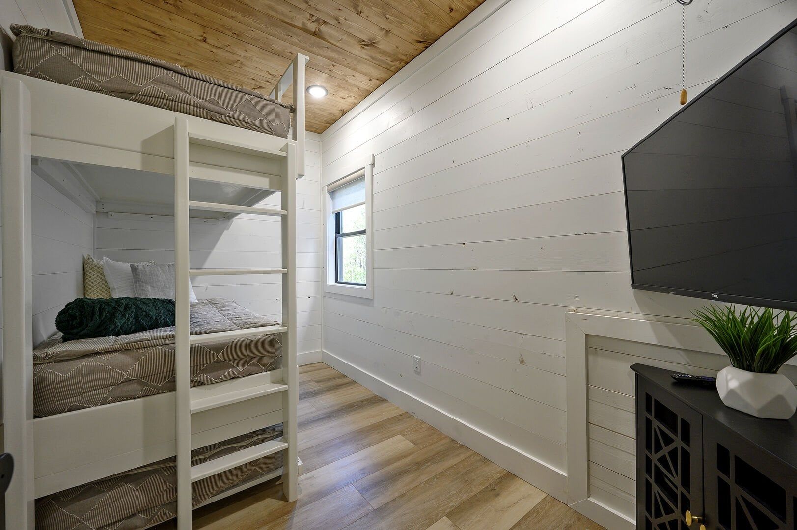 Three king bedrooms of Wildest Dreams offer private, quiet resting places, each furnished with Smart TVs and soft bedding. Two rooms are on the main floor, including ensuite bathrooms with stand-up showers and relaxing soaking tubs. The third king bedroom sits upstairs and shares a full bathroom in the hallway, serving the nearby bunk room and loft area. The bunk room, designed with kids or young adults in mind, features two twin beds and easy access to the upstairs bathroom, giving every guest space and privacy. The upstairs game loft includes a shuffleboard table, foosball, a sitting area, and a sleeper sofa, making it the perfect hangout for games or reading.