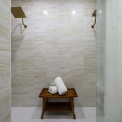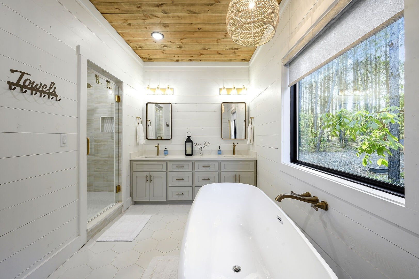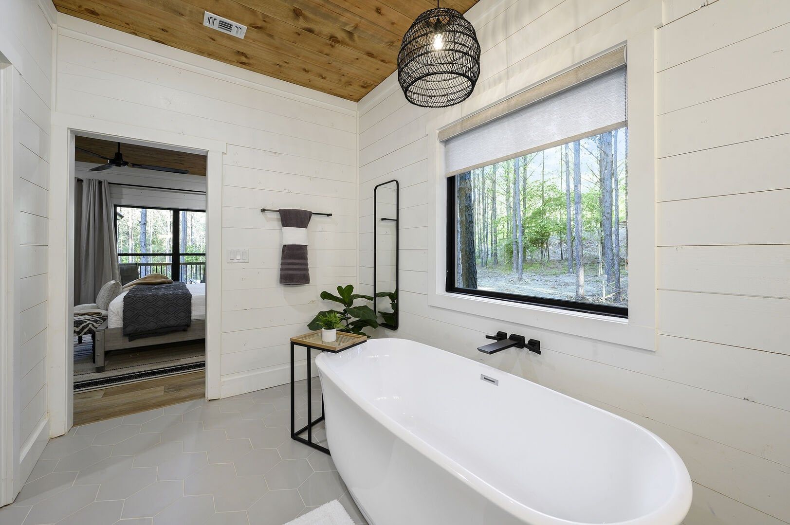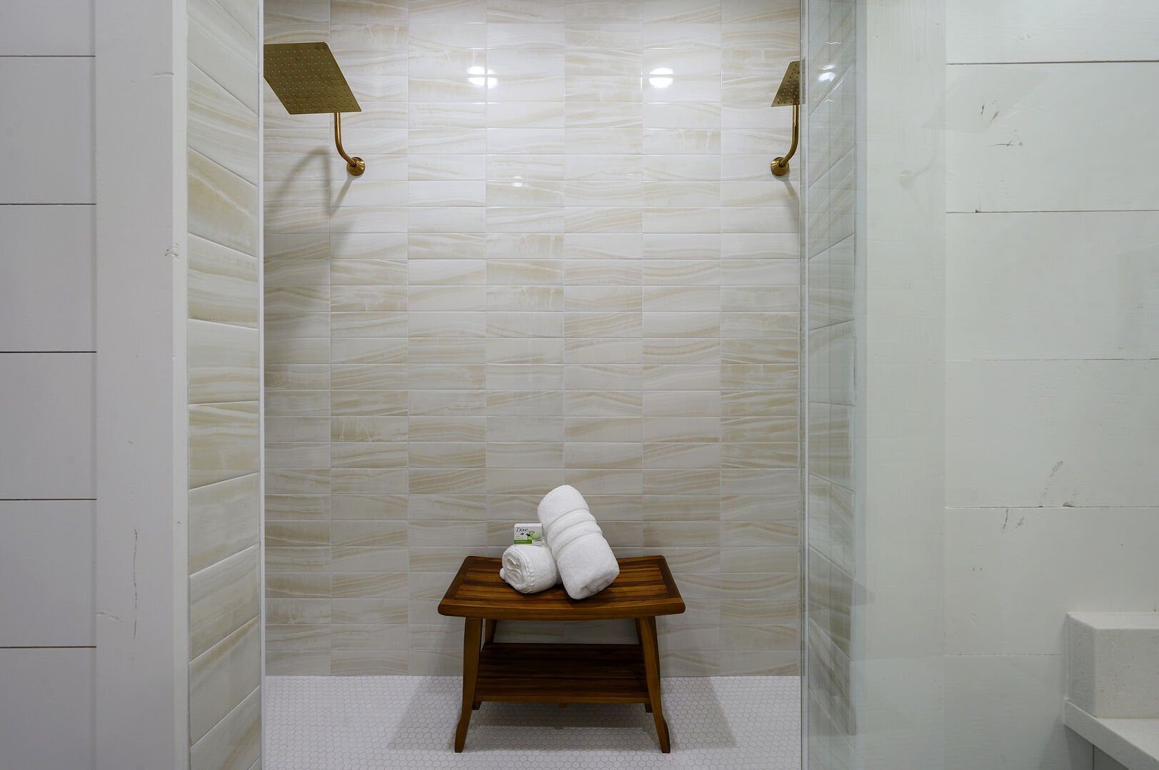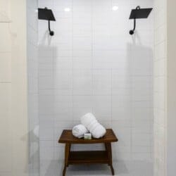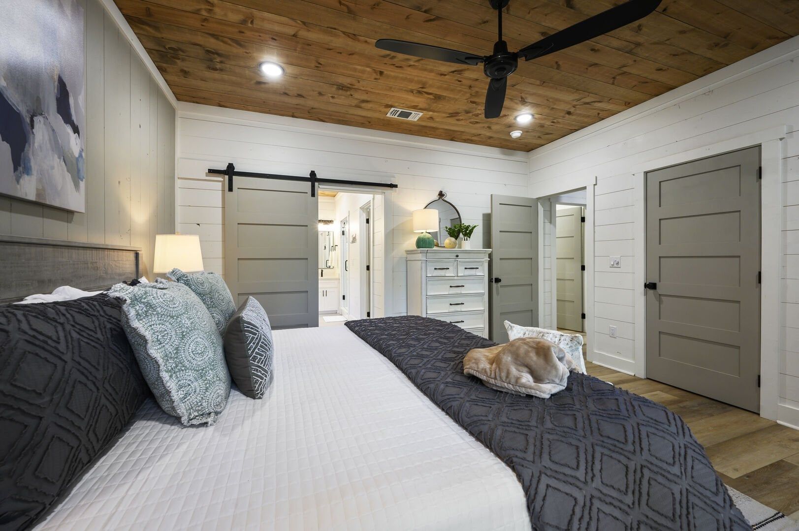 Three king bedrooms of Wildest Dreams offer private, quiet resting places, each furnished with Smart TVs and soft bedding. Two rooms are on the main floor, including ensuite bathrooms with stand-up showers and relaxing soaking tubs. The third king bedroom sits upstairs and shares a full bathroom in the hallway, serving the nearby bunk room and loft area. The bunk room, designed with kids or young adults in mind, features two twin beds and easy access to the upstairs bathroom, giving every guest space and privacy. The upstairs game loft includes a shuffleboard table, foosball, a sitting area, and a sleeper sofa, making it the perfect hangout for games or reading.