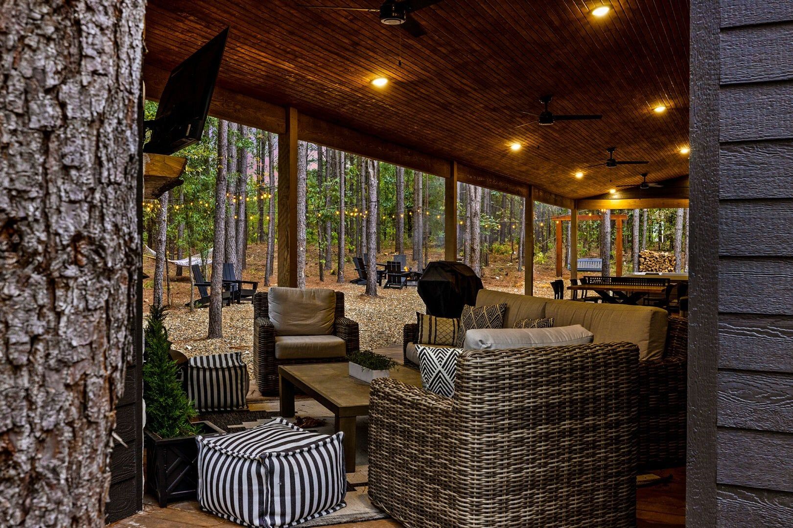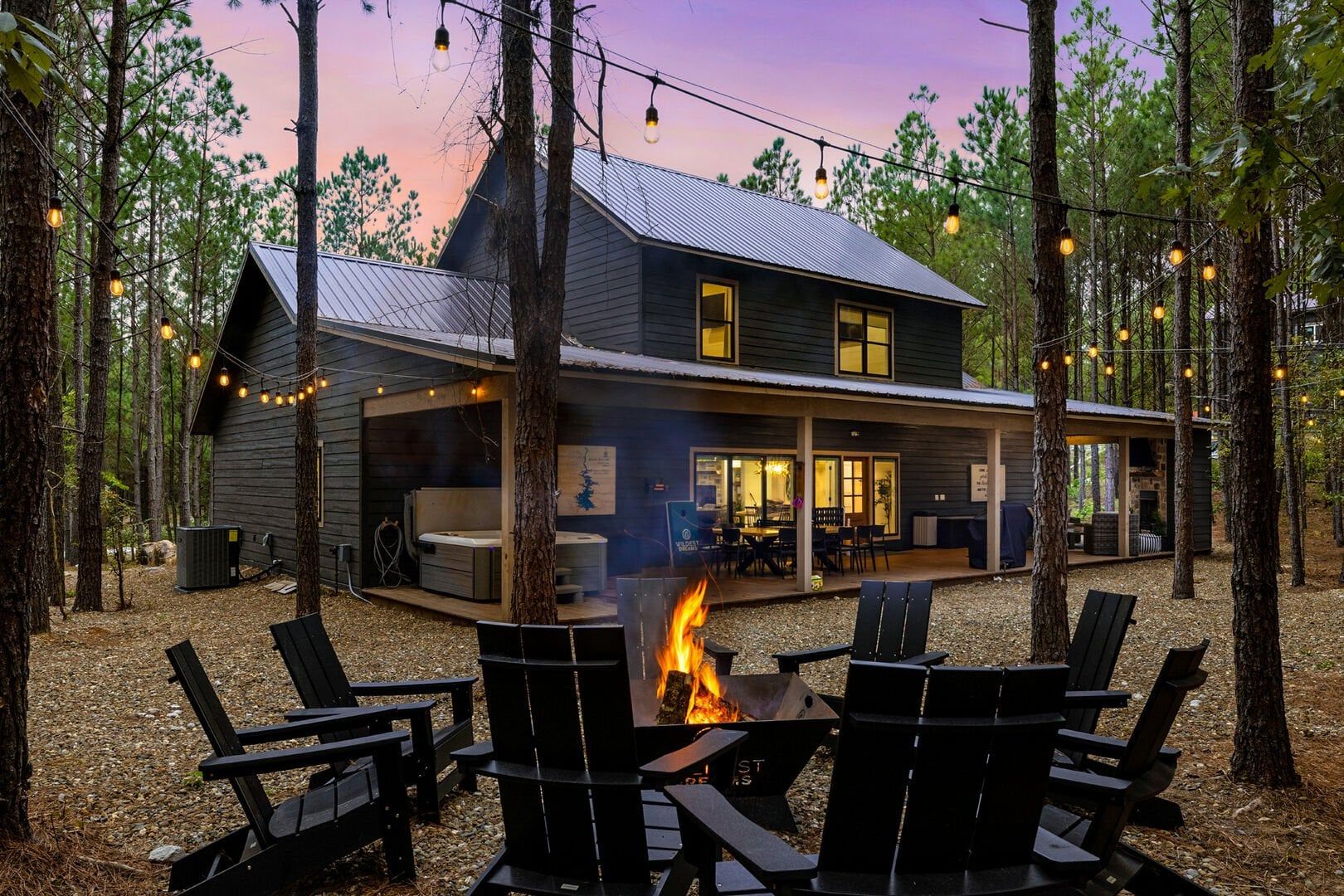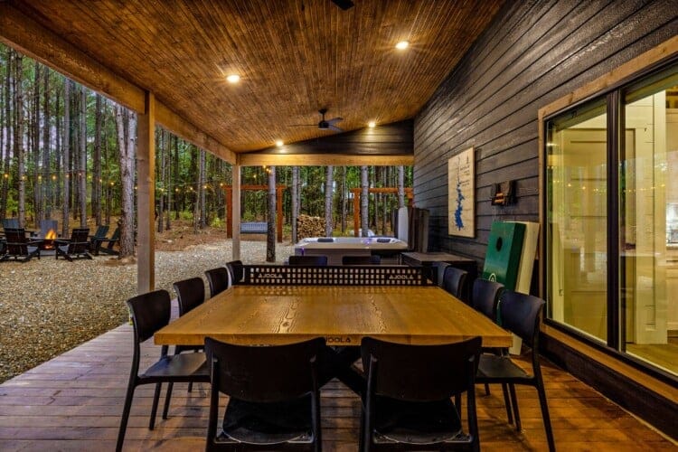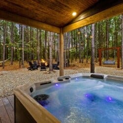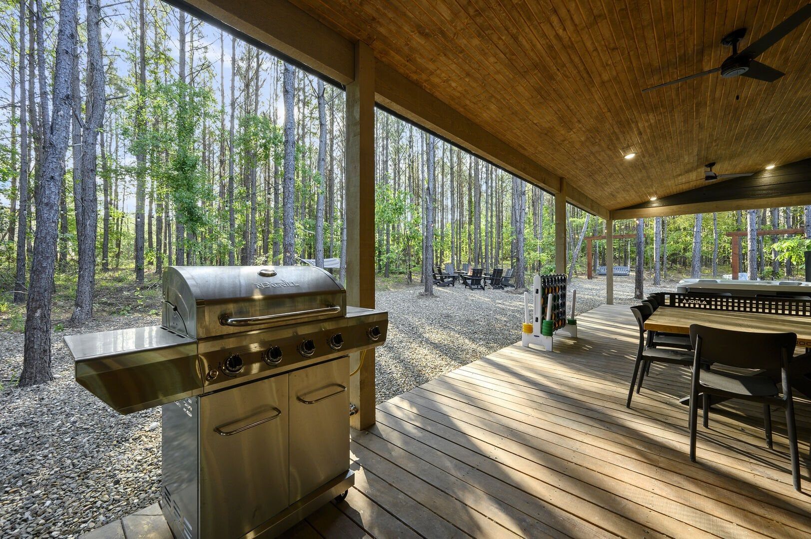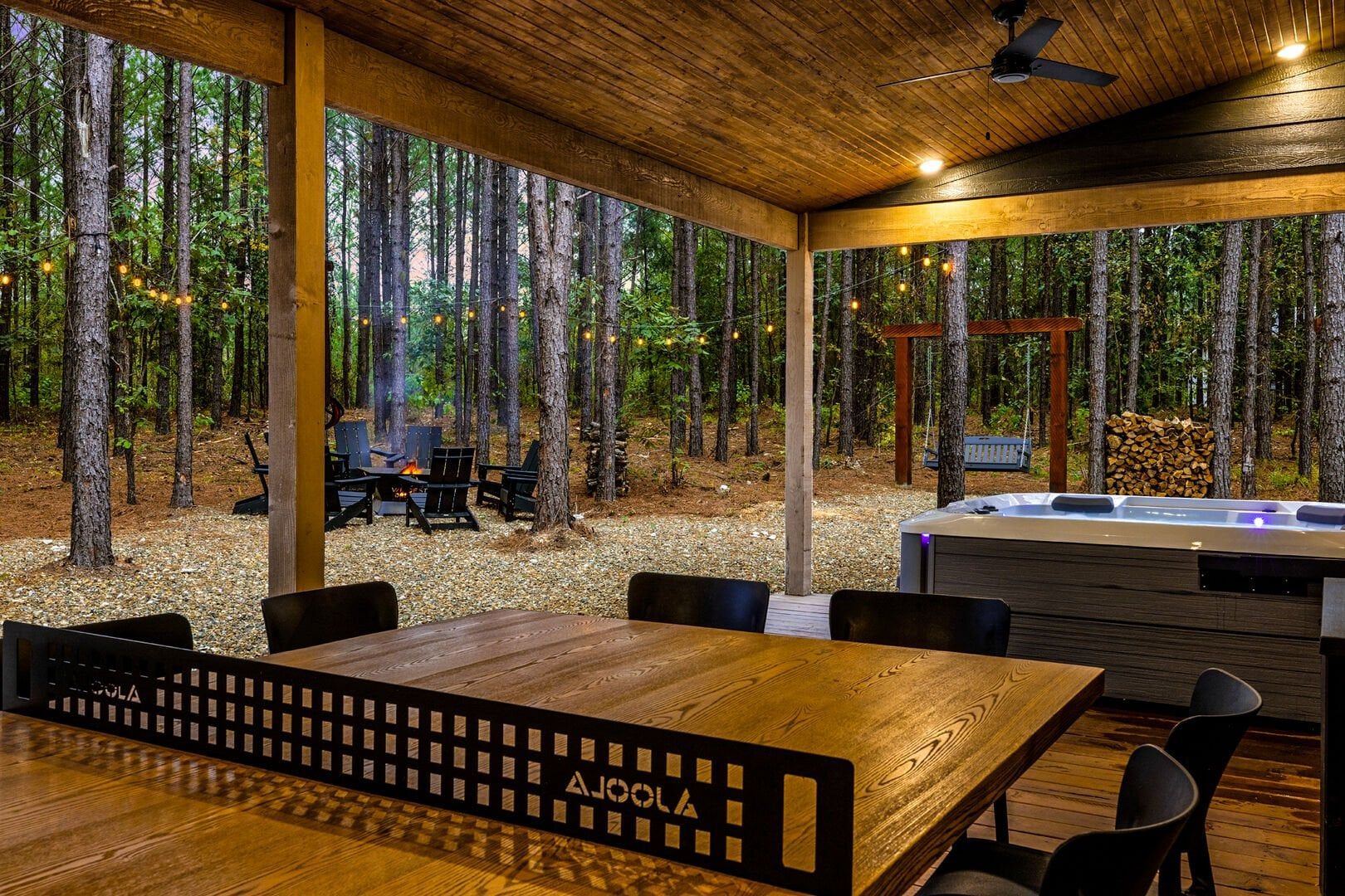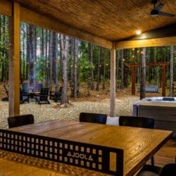 Outside, the Wildest Dreams cabin reveals even more space for relaxation and fun. A covered, lighted hot tub sits tucked into a peaceful corner, ready to ease tired muscles while the sounds of nature fill the air. Guests can grill meals using the propane BBQ grill and enjoy dinner at the outdoor dining table with views of tall pine trees. After the sun sets, the fire pit becomes a favorite spot to share stories and roast marshmallows, with comfortable chairs surrounding the warm glow. A ping pong table and corn hole boards invite everyone to join in on the friendly competition, while a hammock and swings add peaceful places to unwind.