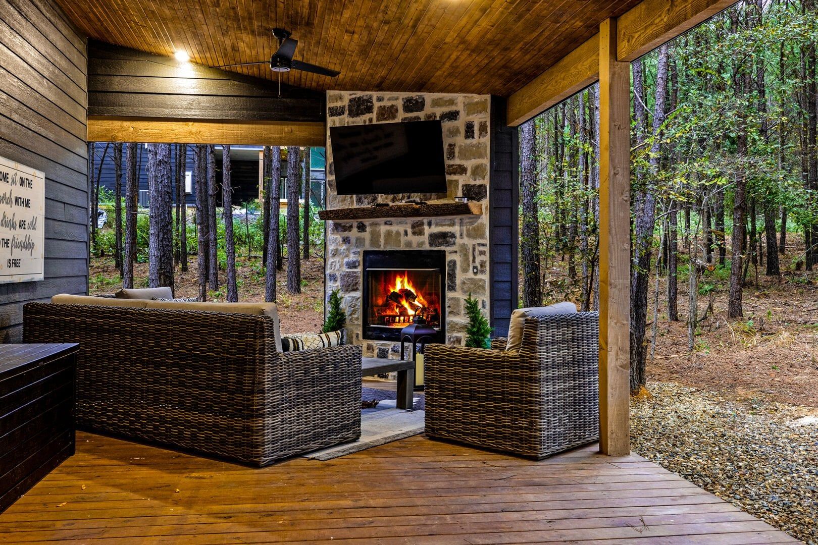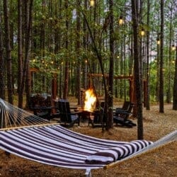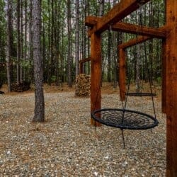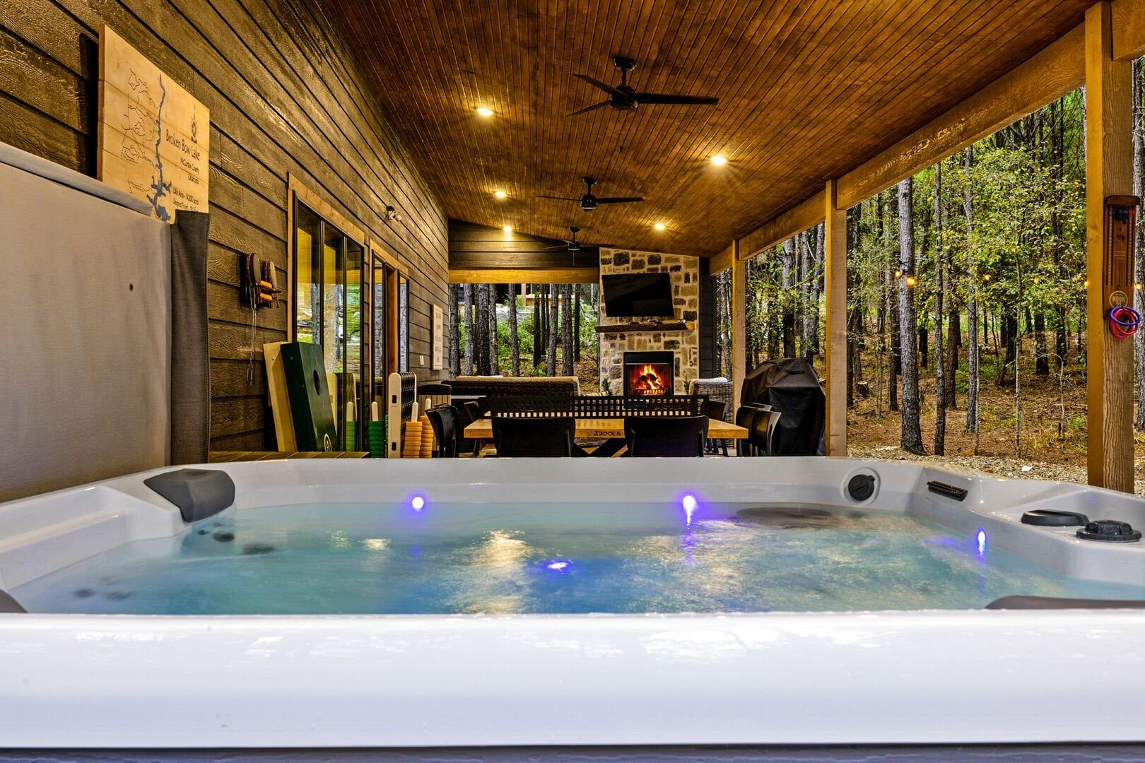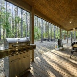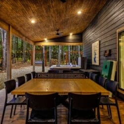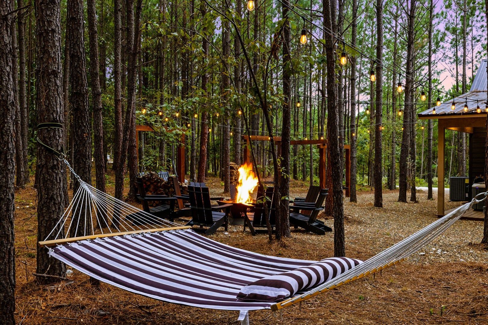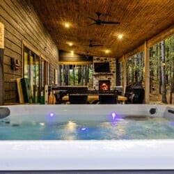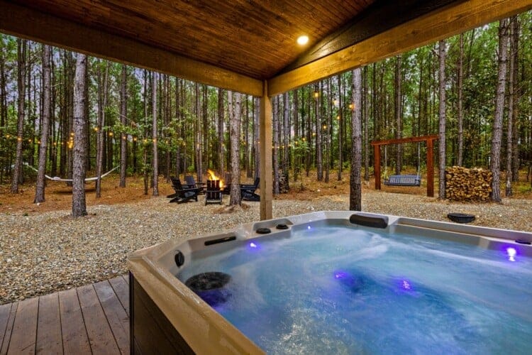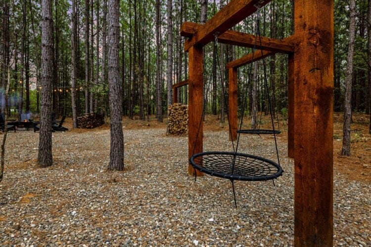 Outside, the Wildest Dreams cabin reveals even more space for relaxation and fun. A covered, lighted hot tub sits tucked into a peaceful corner, ready to ease tired muscles while the sounds of nature fill the air. Guests can grill meals using the propane BBQ grill and enjoy dinner at the outdoor dining table with views of tall pine trees. After the sun sets, the fire pit becomes a favorite spot to share stories and roast marshmallows, with comfortable chairs surrounding the warm glow. A ping pong table and corn hole boards invite everyone to join in on the friendly competition, while a hammock and swings add peaceful places to unwind.