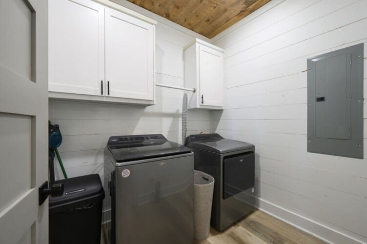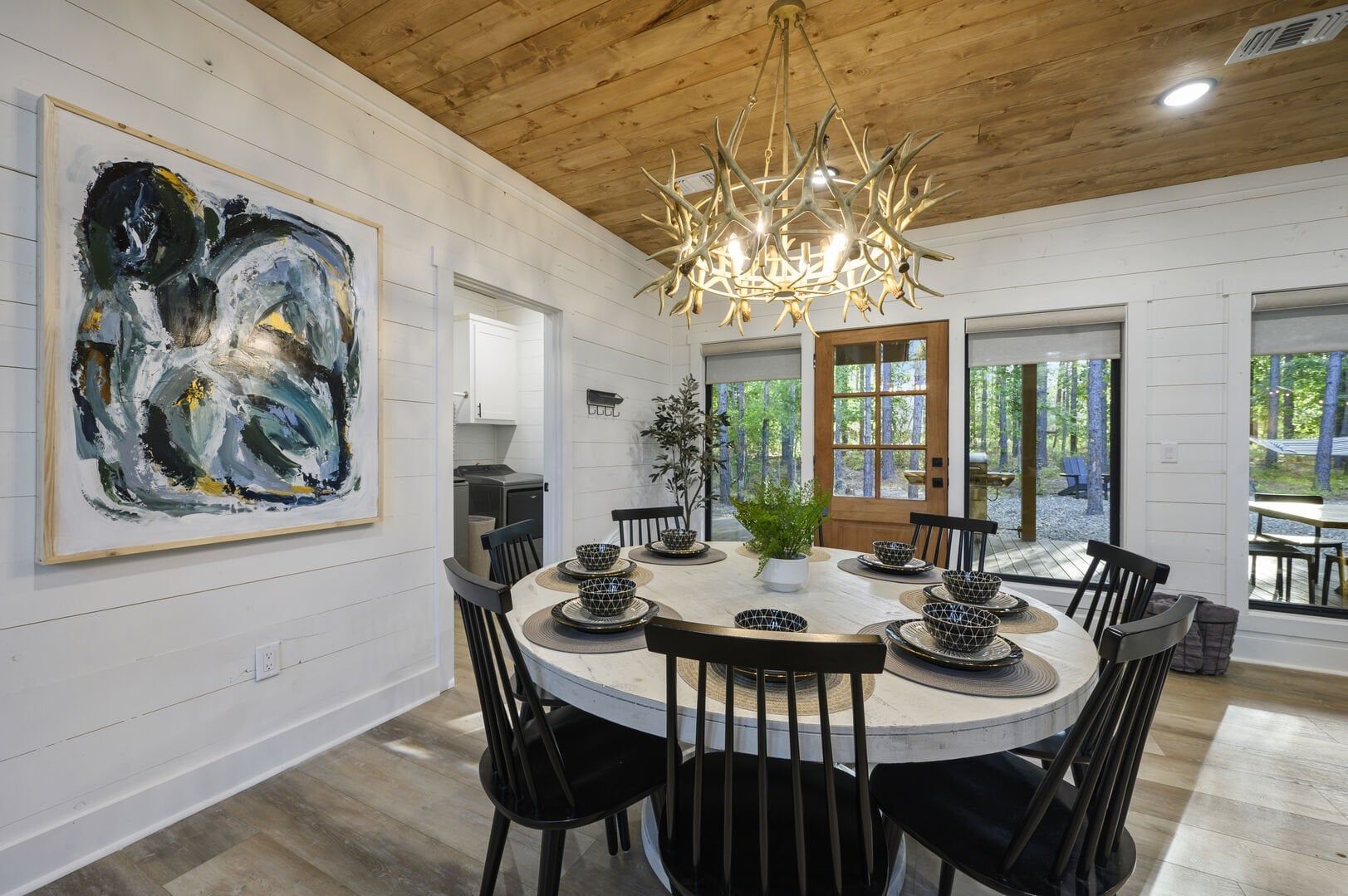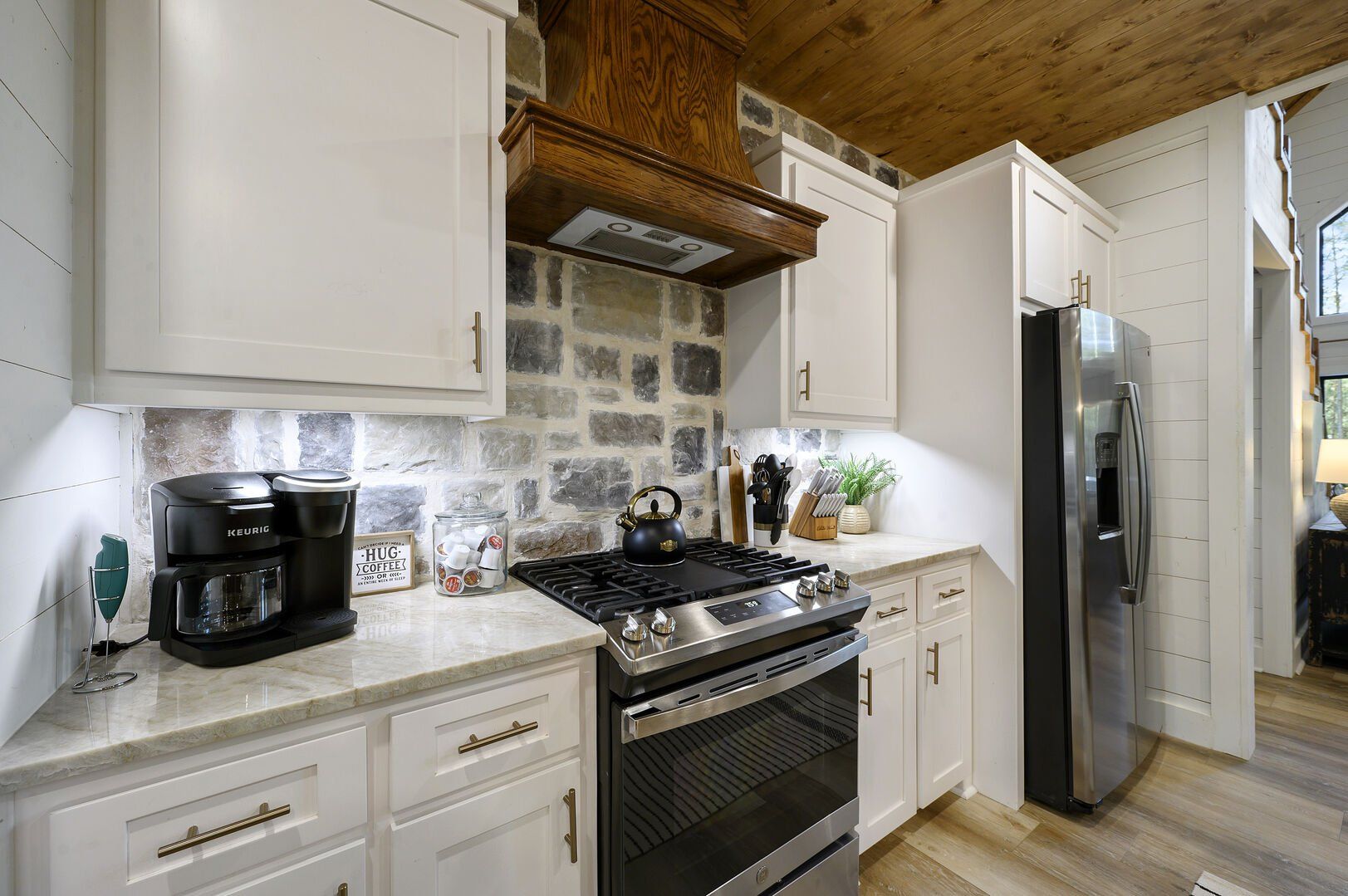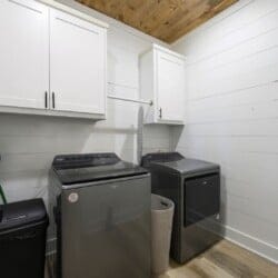 In the Wildest Dreams kitchen, guests find all the tools needed to make everything from a big family dinner to a quick breakfast. The sleek cabinets, stainless steel appliances, and oversized fridge simplify food prep. The kitchen island provides extra space for serving or seating, and the dining table seats everyone together. A dual Keurig coffee bar ensures mornings start strong, with plenty of mugs and K-Cups provided. The laundry closet nearby houses a full washer and dryer, allowing guests to keep everything clean during longer stays.